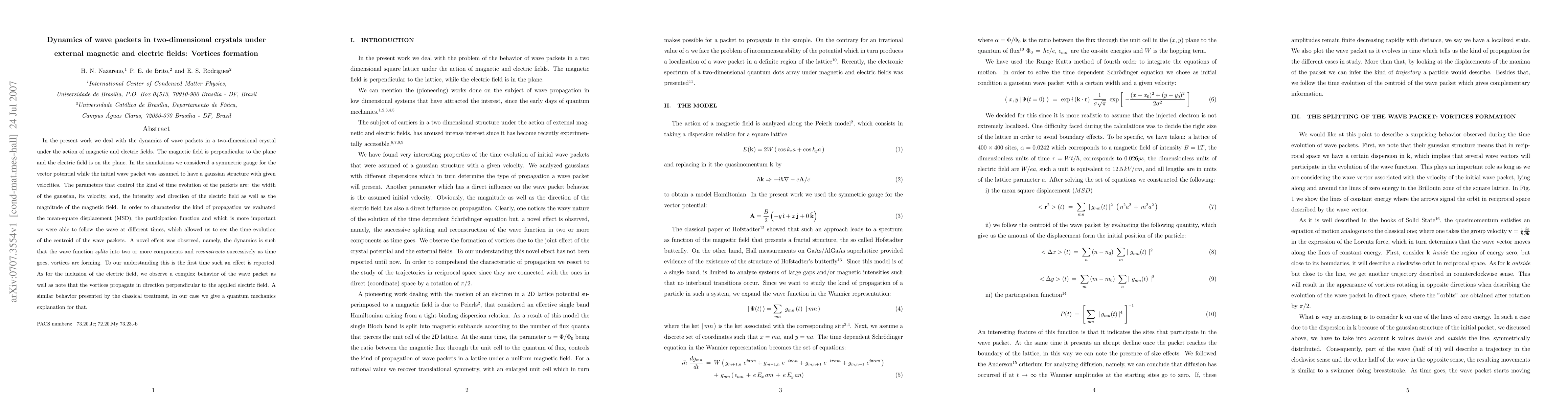 In the present work we deal with the dynamics of wave packets in a two-dimensional crystal under the action of magnetic and electric fields. The magnetic field is perpendicular to the plane and the electric field is on the plane. In the simulations we considered a symmetric gauge for the vector potential while the initial wave packet was assumed to have a gaussian structure with given velocities. The parameters that control the kind of time evolution of the packets are: the width of the gaussian, its velocity, and, the intensity and direction of the electric field as well as the magnitude of the magnetic field. In order to characterize the kind of propagation we evaluated the mean-square displacement (MSD), the participation function and which is more important we were able to follow the wave at different times, which allowed us to see the time evolution of the centroid of the wave packets. A novel effect was observed, namely, the dynamics is such that the wave function \emph{splits} into two or more components and \emph{reconstructs} successively as time goes, vortices are forming. To our understanding this is the first time such an effect is reported. As for the inclusion of the electric field, we observe a complex behavior of the wave packet as well as note that the vortices propagate in direction perpendicular to the applied electric field. A similar behavior presented by the classical treatment, In our case we give a quantum mechanics explanation for that