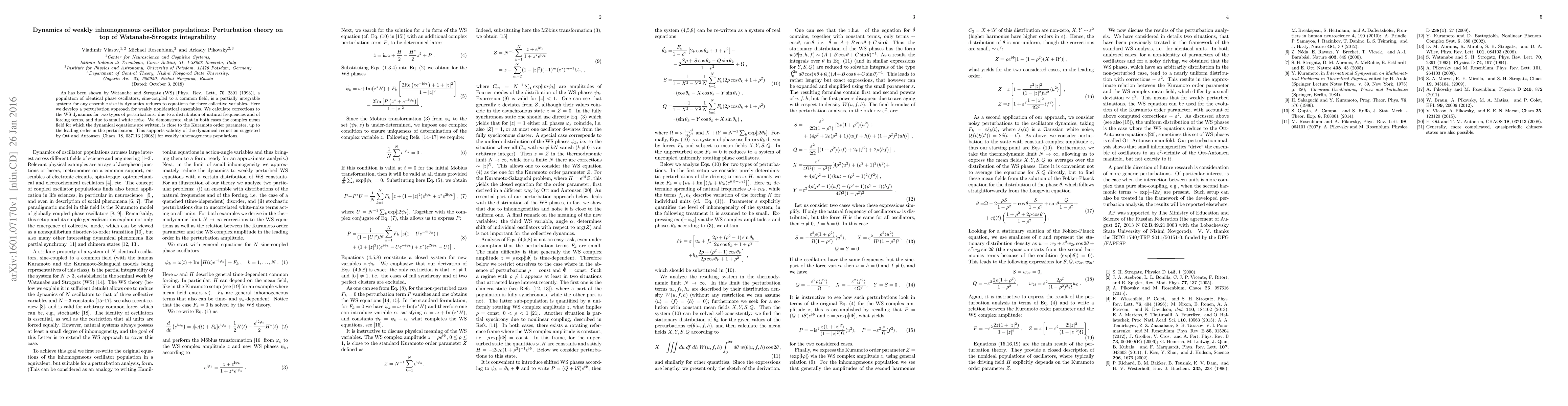 As has been shown by Watanabe and Strogatz (WS) [Phys. Rev. Lett., 70, 2391 (1993)], a population of identical phase oscillators, sine-coupled to a common field, is a partially integrable system for any size: its dynamics reduces to equations for several collective variables. Here we develop a perturbation approach for weakly nonidentical ensembles. We calculate corrections to the WS dynamics for two types of perturbations: due to a distribution of natural frequencies and of forcing terms, and due to small white noise. We demonstrate, that in both cases the complex mean field for which the dynamical equations are written, is close up to the leading order in the perturbation to the Kuramoto order parameter. This supports validity of the dynamical reduction suggested by Ott and Antonsen [Chaos, 18, 037113 (2008)] for weakly inhomogeneous populations.