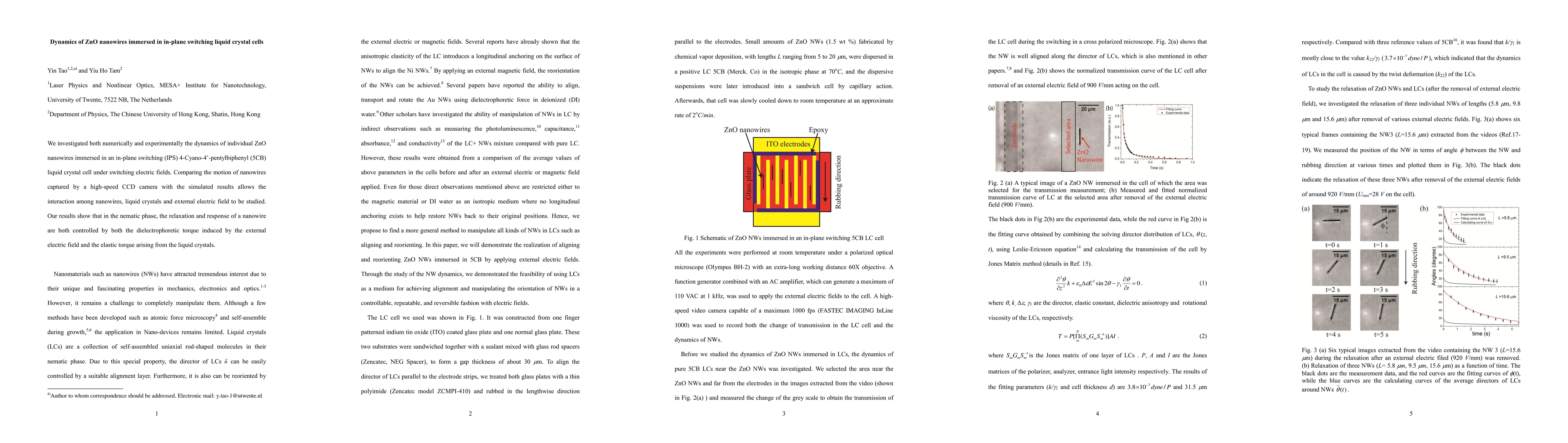This study numerically and experimentally investigates the dynamics of ZnO nanowires in an in-plane switching liquid crystal cell under electric fields, revealing that nanowire relaxation and response are influenced by both dielectrophoretic and elastic torques. The findings provide insights into the interaction between nanowires, liquid crystals, and external electric fields.