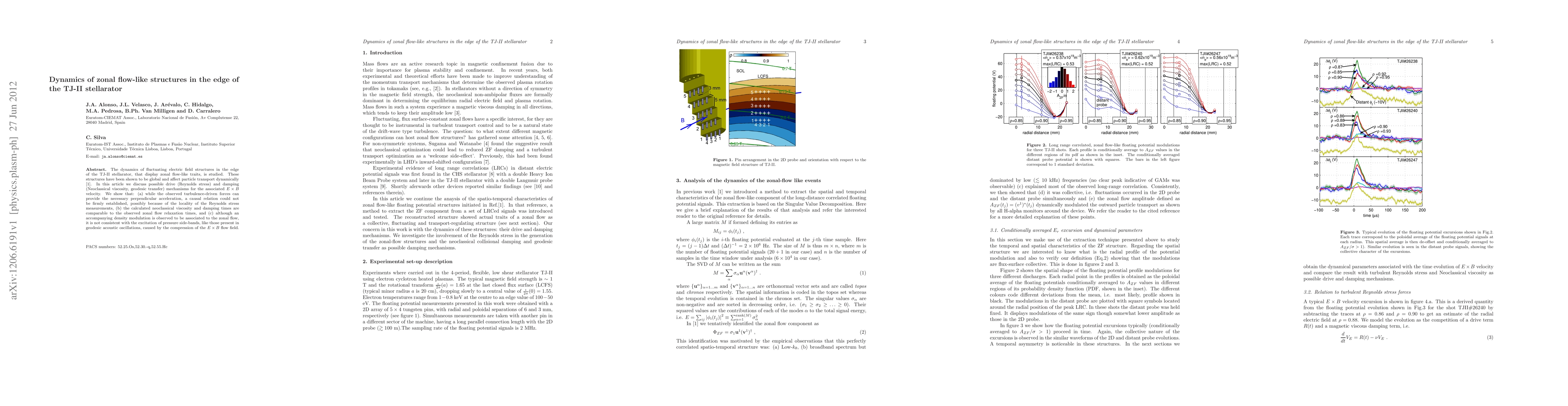 The dynamics of fluctuating electric field structures in the edge of the TJ-II stellarator, that display zonal flow-like traits, is studied. These structures have been shown to be global and affect particle transport dynamically [J.A. Alonso et al., Nucl. Fus. 52 063010 (2012)]. In this article we discuss possible drive (Reynolds stress) and damping (Neoclassical viscosity, geodesic transfer) mechanisms for the associated ExB velocity. We show that: (a) while the observed turbulence-driven forces can provide the necessary perpendicular acceleration, a causal relation could not be firmly established, possibly because of the locality of the Reynolds stress measurements, (b) the calculated neoclassical viscosity and damping times are comparable to the observed zonal flow relaxation times, and (c) although an accompanying density modulation is observed to be associated to the zonal flow, it is not consistent with the excitation of pressure side-bands, like those present in geodesic acoustic oscillations, caused by the compression of the ExB flow field.