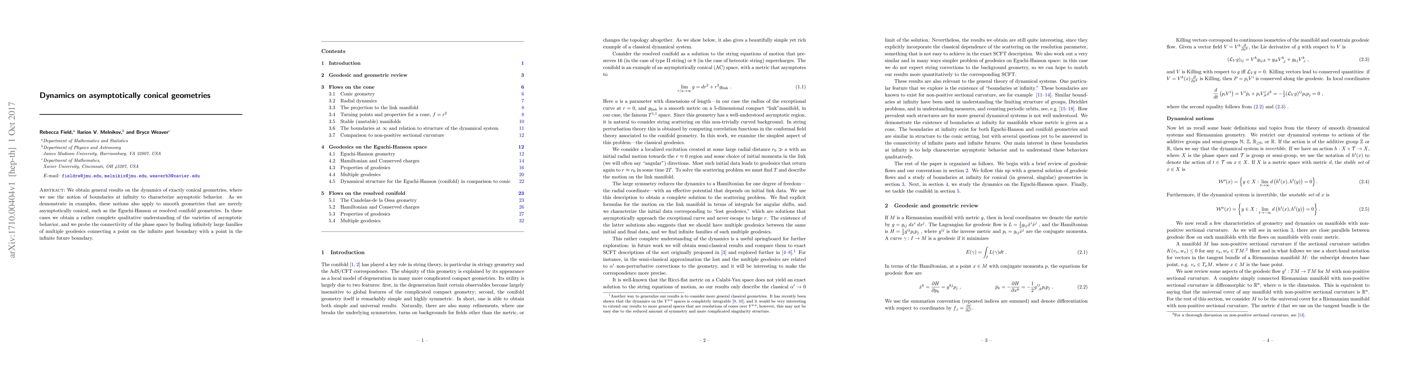 Researchers have developed a new understanding of the dynamics on exactly conical geometries, including asymptotically conical smooth geometries like Eguchi-Hanson and resolved conifold geometries, revealing complete qualitative insights into their behavior.