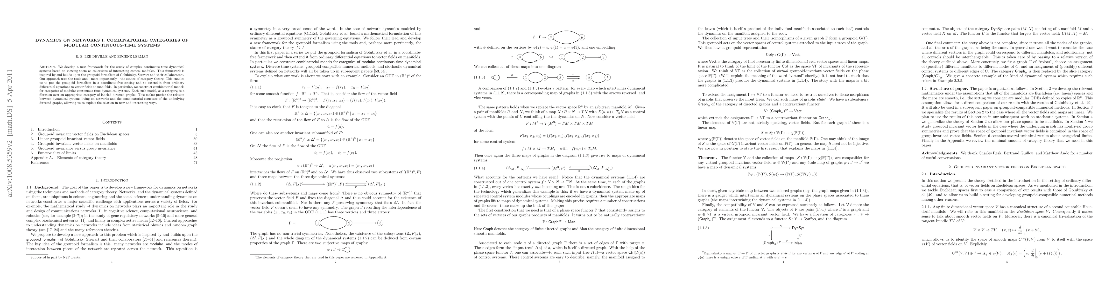 We develop a new framework for the study of complex continuous time dynamical systems based on viewing them as collections of interacting control modules. This framework is inspired by and builds upon the groupoid formalism of Golubitsky, Stewart and their collaborators. Our approach uses the tools and --- more importantly ---the stance of category theory. This enables us to put the groupoid formalism in a coordinate-free setting and to extend it from ordinary differential equations to vector fields on manifolds. In particular, we construct combinatorial models for categories of modular continuous time dynamical systems. Each such model, as a category, is a fibration over an appropriate category of labeled directed graphs. This makes precise the relation between dynamical systems living on networks and the combinatorial structure of the underlying directed graphs, allowing us to exploit the relation in new and interesting ways.