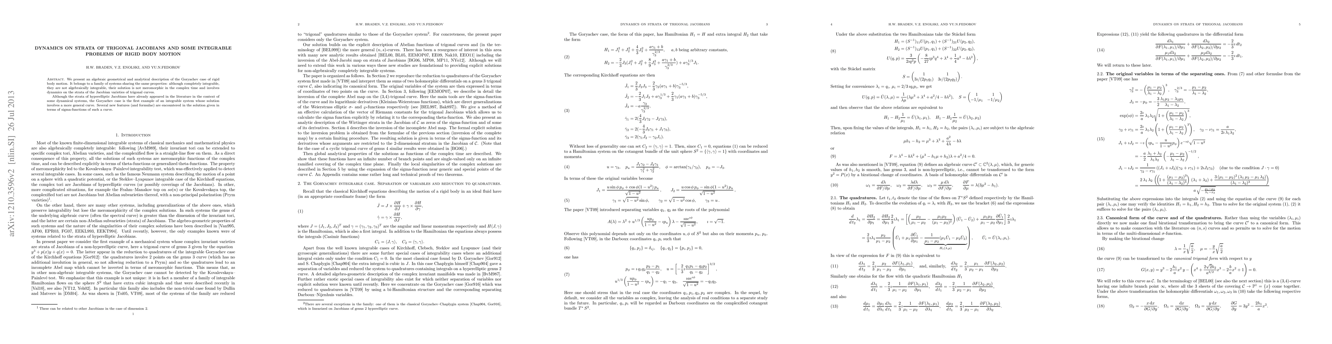 We present an algebraic geometrical and analytical description of the Goryachev case of rigid body motion. It belongs to a family of systems sharing the same properties: although completely integrable, they are not algebraically integrable, their solution is not meromorphic in the complex time and involves dynamics on the strata of the Jacobian varieties of trigonal curves. Although the strata of hyperelliptic Jacobians have already appeared in the literature in the context of some dynamical systems, the Goryachev case is the first example of an integrable system whose solution involves a more general curve. Several new features (and formulae) are encountered in the solution given in terms of sigma-functions of such a curve.