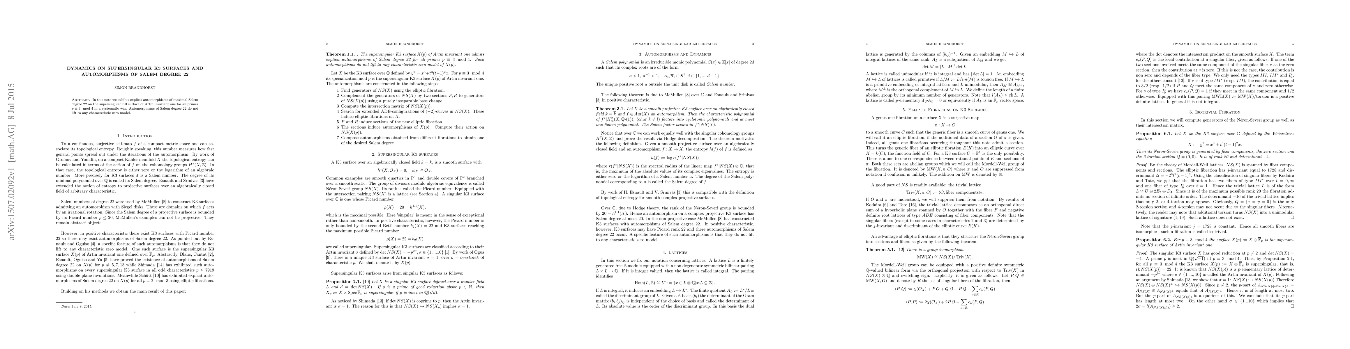 Summary: This paper systematically presents explicit automorphisms of maximal Salem degree 22 on supersingular K3 surfaces with Artin invariant one for primes p congruent to 3 mod 4. It also notes that these automorphisms do not lift to any characteristic zero model.