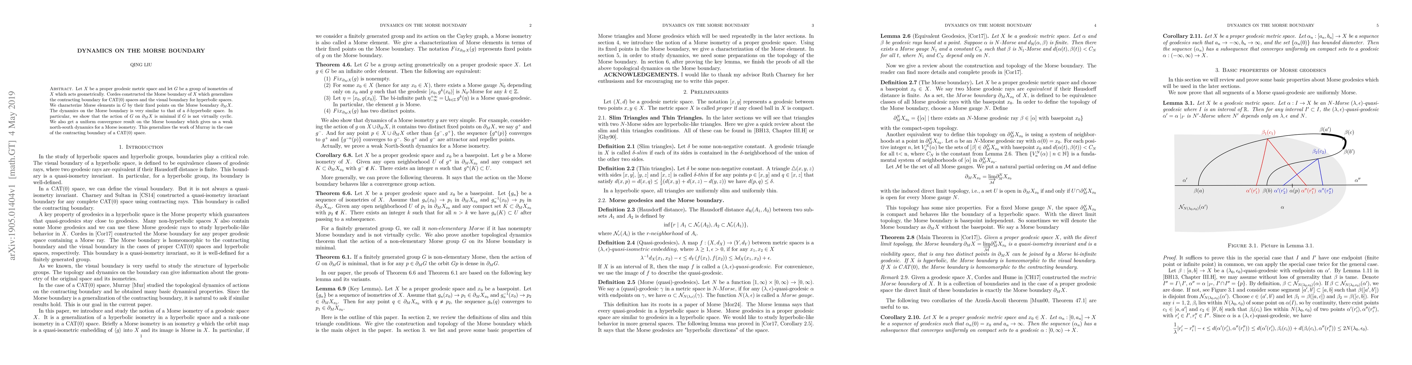 Let $X$ be a proper geodesic metric space and let $G$ be a group of isometries of $X$ which acts geometrically. Cordes constructed the Morse boundary of $X$ which generalizes the contracting boundary for CAT(0) spaces and the visual boundary for hyperbolic spaces. We characterize Morse elements in $G$ by their fixed points on the Morse boundary $\partial_MX$. The dynamics on the Morse boundary is very similar to that of a $\delta$-hyperbolic space. In particular, we show that the action of $G$ on $\partial_MX$ is minimal if $G$ is not virtually cyclic. We also get a uniform convergence result on the Morse boundary which gives us a weak north-south dynamics for a Morse isometry. This generalizes the work of Murray in the case of the contracting boundary of a CAT(0) space.