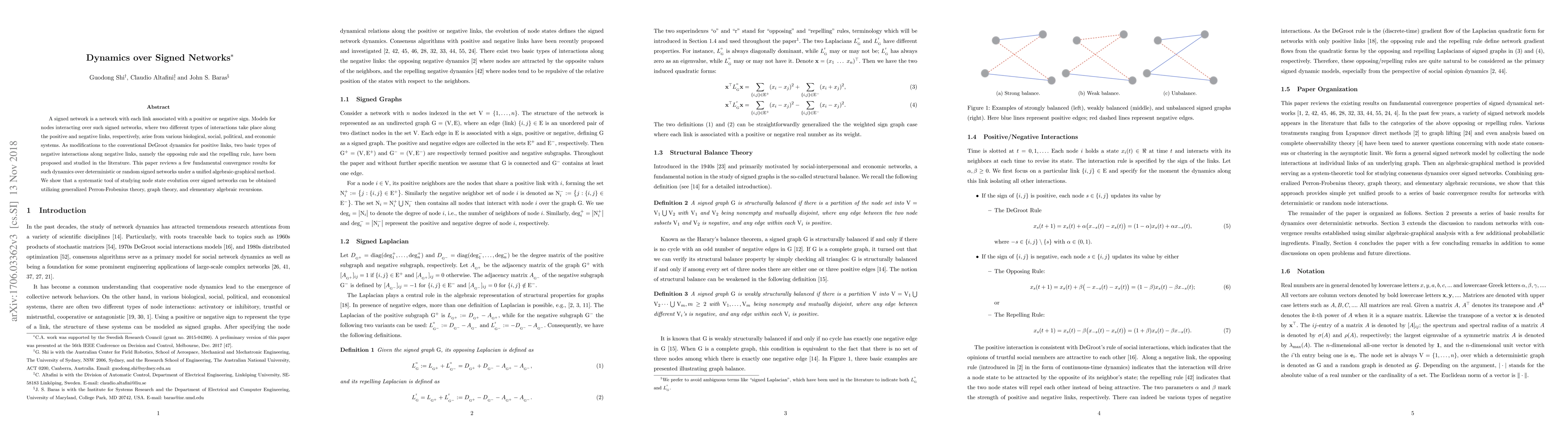 This paper reviews convergence results for dynamics over signed networks, proposing modifications to DeGroot dynamics for positive links with opposing and repelling rules for negative links. It utilizes generalized Perron-Frobenius theory, graph theory, and algebraic recursions to study node state evolution.