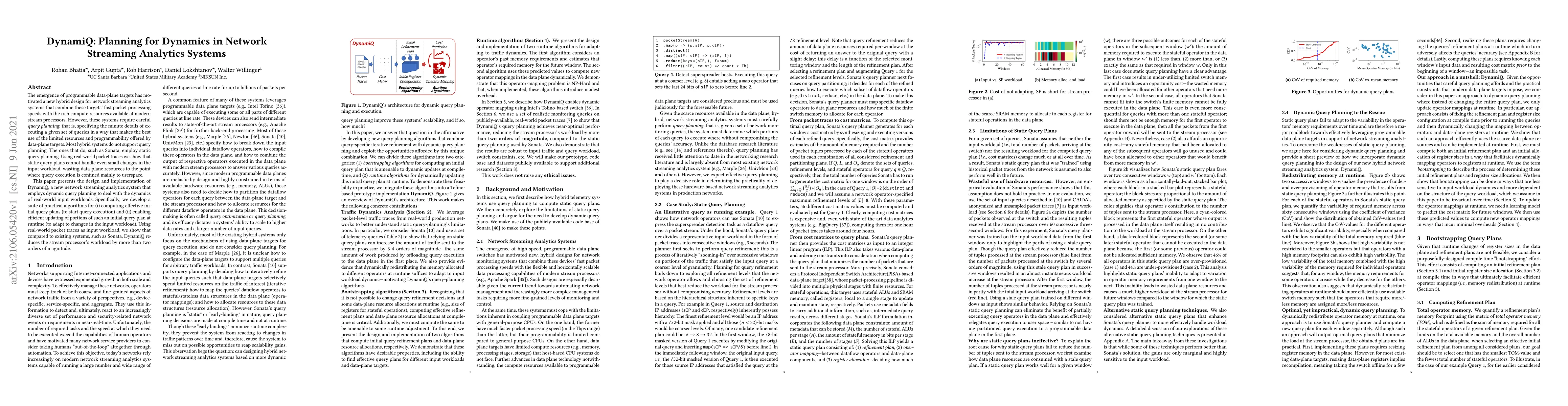 The emergence of programmable data-plane targets has motivated a new hybrid design for network streaming analytics systems that combine these targets' fast packet processing speeds with the rich compute resources available at modern stream processors. However, these systems require careful query planning; that is, specifying the minute details of executing a given set of queries in a way that makes the best use of the limited resources and programmability offered by data-plane targets. We use such an existing system, Sonata, and real-world packet traces to understand how executing a fixed query workload is affected by the unknown dynamics of the traffic that defines the target's input workload. We observe that static query planning, as employed by Sonata, cannot handle even small changes in the input workload, wasting data-plane resources to the point where query execution is confined mainly to userspace. This paper presents the design and implementation of DynamiQ, a new network streaming analytics platform that employs dynamic query planning to deal with the dynamics of real-world input workloads. Specifically, we develop a suite of practical algorithms for (i) computing effective initial query plans (to start query execution) and (ii) enabling efficient updating of portions of such an initial query plan at runtime (to adapt to changes in the input workload). Using real-world packet traces as input workload, we show that compared to Sonata, DynamiQ reduces the stream processor's workload by two orders of magnitude.