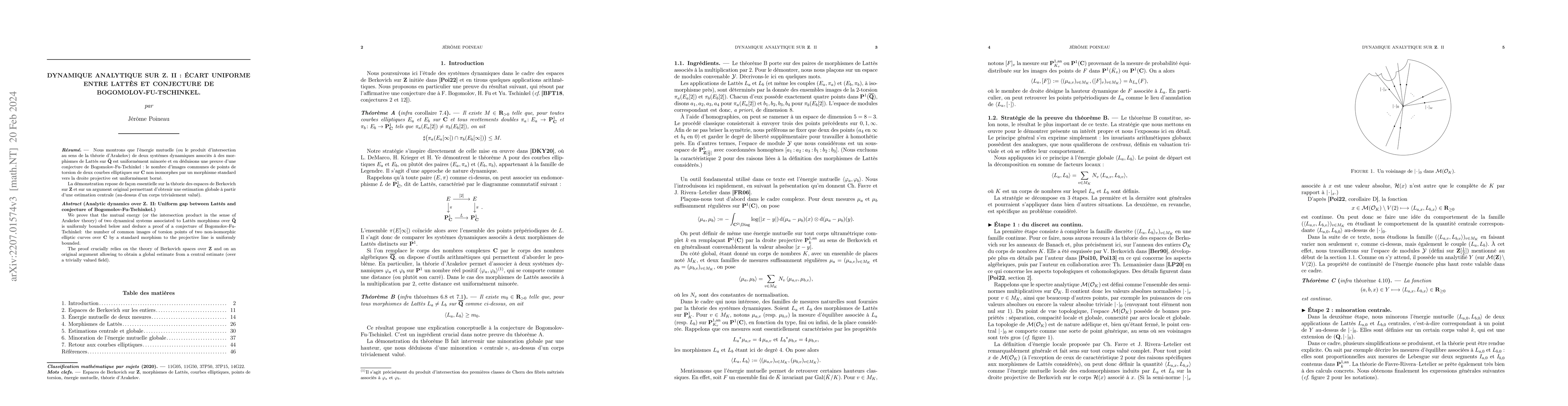 We prove that the mutual energy (or the intersection product in the sense of Arakelov theory) of two dynamical systems associated to Latt\`es morphisms over $\mathbf{\bar Q}$ is uniformly bounded below and deduce a proof of a conjecture of Bogomolov-Fu-Tschinkel: the number of common images of torsion points of two non-isomorphic elliptic curves over $\mathbf{C}$ by a standard morphism to the projective line is uniformly bounded. The proof crucially relies on the theory of Berkovich spaces over $\mathbf{Z}$ and on an original argument allowing to obtain a global estimate from a central estimate (over a trivially valued field).