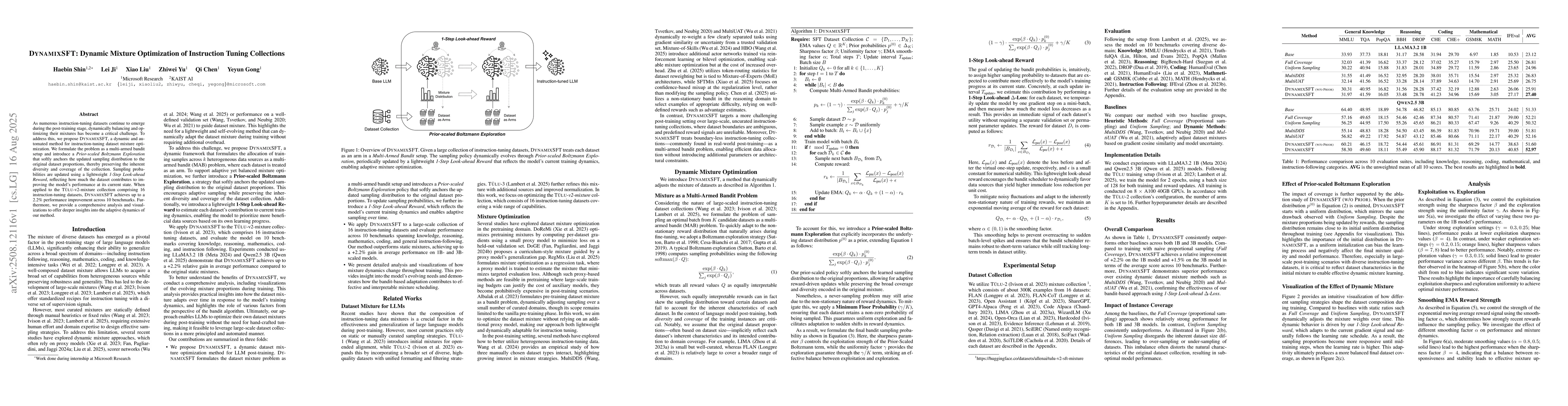 As numerous instruction-tuning datasets continue to emerge during the post-training stage, dynamically balancing and optimizing their mixtures has become a critical challenge. To address this, we propose DynamixSFT, a dynamic and automated method for instruction-tuning dataset mixture optimization. We formulate the problem as a multi-armed bandit setup and introduce a Prior-scaled Boltzmann Exploration that softly anchors the updated sampling distribution to the original dataset proportions, thereby preserving the inherent diversity and coverage of the collection. Sampling probabilities are updated using a lightweight 1-Step Look-ahead Reward, reflecting how much the dataset contributes to improving the model's performance at its current state. When applied to the Tulu-v2-mixture collection comprising 16 instruction-tuning datasets, DynamixSFT achieves up to a 2.2% performance improvement across 10 benchmarks. Furthermore, we provide a comprehensive analysis and visualizations to offer deeper insights into the adaptive dynamics of our method.