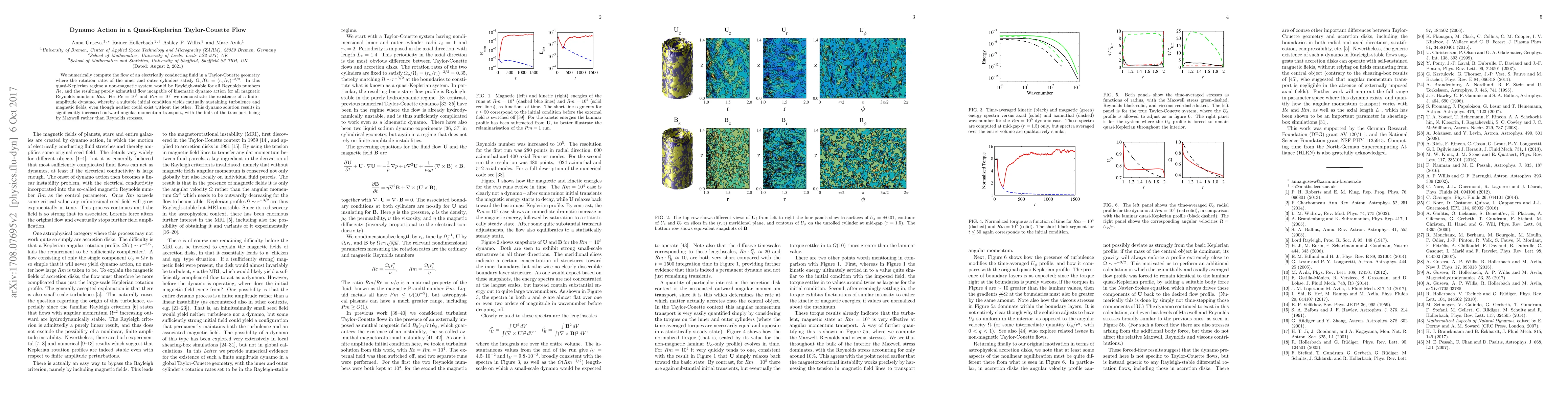 This study numerically investigates dynamo action in a quasi-Keplerian Taylor-Couette flow, demonstrating the emergence of a finite-amplitude dynamo capable of sustaining turbulence and magnetic fields despite theoretical stability predictions. The dynamo enhances outward angular momentum transport primarily via Maxwell stresses.