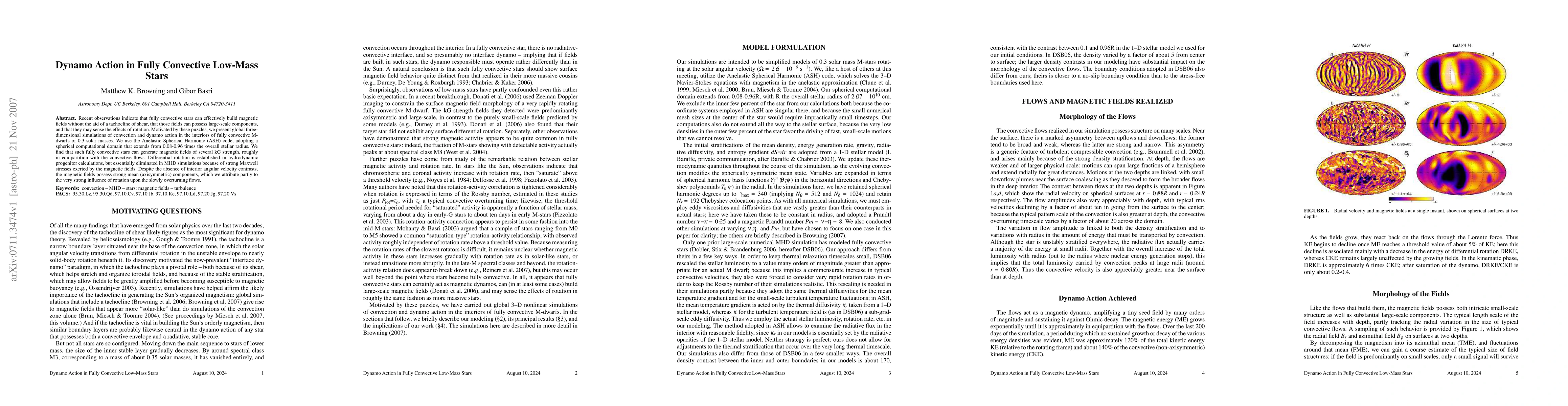 This paper presents global 3D simulations of convection and dynamo action in low-mass M-dwarf stars, finding that they can generate kG-strength magnetic fields without a tachocline, and that rotation strongly influences the generation of strong mean magnetic field components despite the absence of differential rotation.