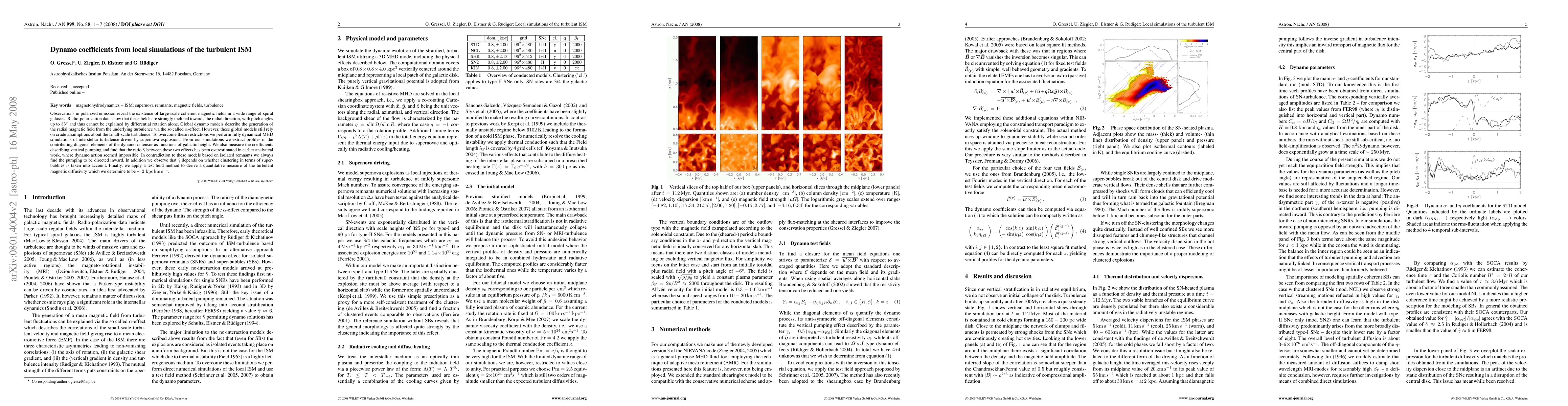 Observations in polarized emission reveal the existence of large-scale coherent magnetic fields in a wide range of spiral galaxies. Radio-polarization data show that these fields are strongly inclined towards the radial direction, with pitch angles up to $35\degr$ and thus cannot be explained by differential rotation alone. Global dynamo models describe the generation of the radial magnetic field from the underlying turbulence via the so called $\alpha$-effect. However, these global models still rely on crude assumptions about the small-scale turbulence. To overcome these restrictions we perform fully dynamical MHD simulations of interstellar turbulence driven by supernova explosions. From our simulations we extract profiles of the contributing diagonal elements of the dynamo $\alpha$-tensor as functions of galactic height. We also measure the coefficients describing vertical pumping and find that the ratio $\hat{\gamma}$ between these two effects has been overestimated in earlier analytical work, where dynamo action seemed impossible. In contradiction to these models based on isolated remnants we always find the pumping to be directed inward. In addition we observe that $\hat{\gamma}$ depends on whether clustering in terms of super-bubbles is taken into account. Finally, we apply a test field method to derive a quantitative measure of the turbulent magnetic diffusivity which we determine to be ~ 2 kpc kms.