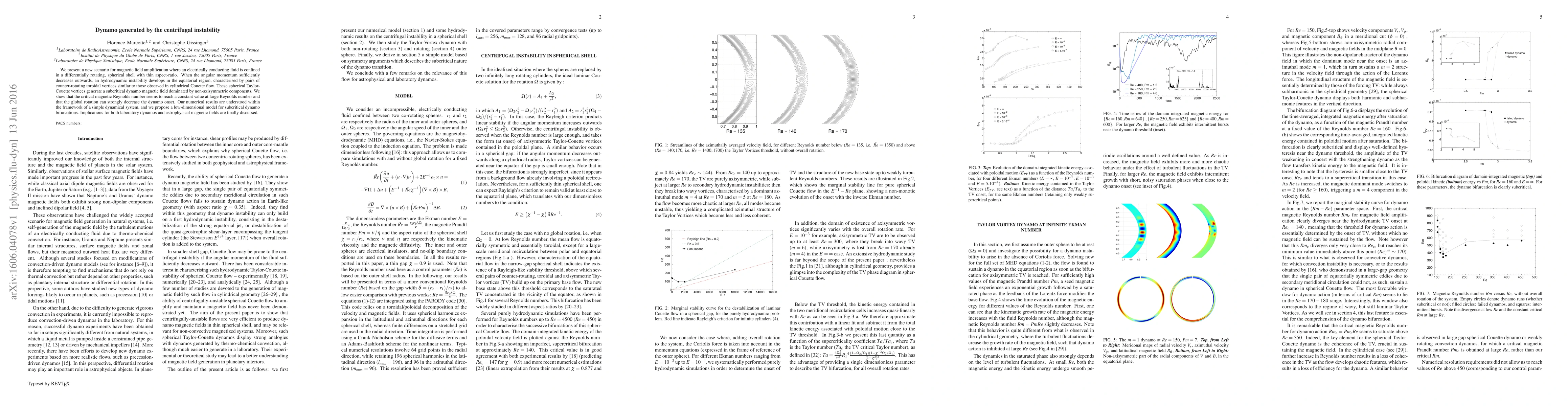 This paper explores a new mechanism for magnetic field amplification in a differentially rotating, electrically conducting fluid within a spherical shell, where centrifugal instability generates toroidal vortices leading to a subcritical dynamo. The study finds that global rotation significantly delays dynamo onset, with implications for both laboratory and astrophysical magnetic fields.
