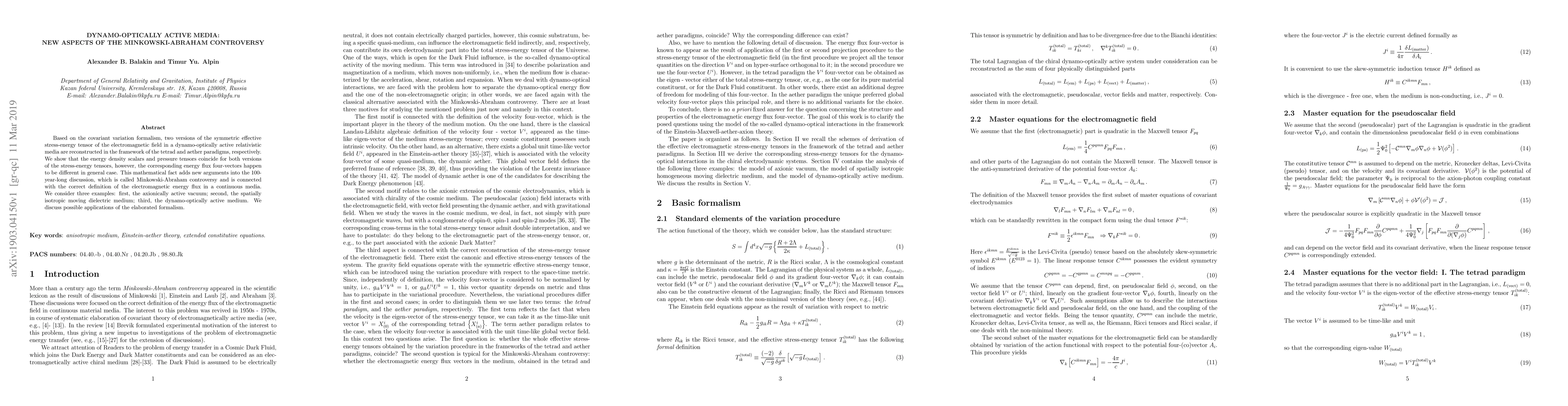 Researchers reconstruct two versions of electromagnetic stress-energy tensors for dynamo-optically active media, finding that energy density scalars and pressure tensors coincide but energy flux four-vectors differ, adding new insights to the 100-year-old Minkowski-Abraham controversy.