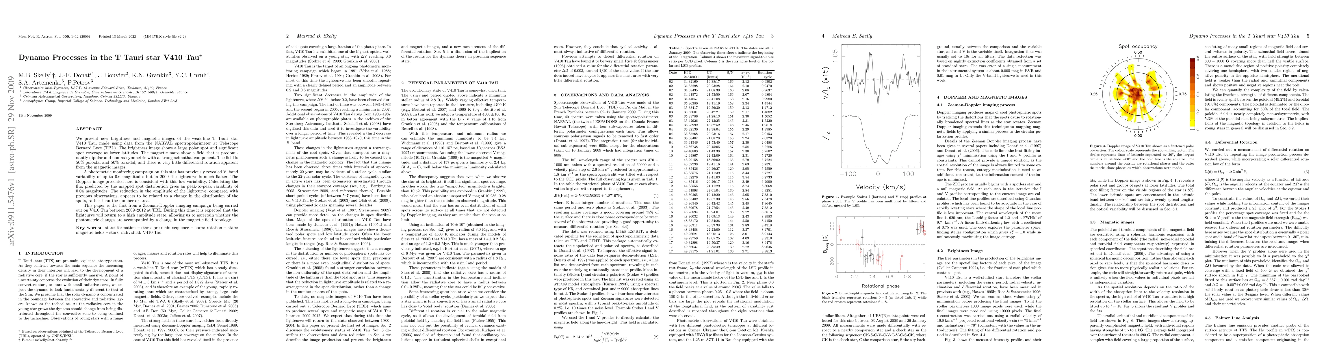We present new brightness and magnetic images of the weak-line T Tauri star V410 Tau, made using data from the NARVAL spectropolarimeter at Telescope Bernard Lyot (TBL). The brightness image shows a large polar spot and significant spot coverage at lower latitudes. The magnetic maps show a field that is predominantly dipolar and non-axisymmetric with a strong azimuthal component. The field is 50% poloidal and 50% toroidal, and there is very little differential rotation apparent from the magnetic images. A photometric monitoring campaign on this star has previously revealed V-band variability of up to 0.6 magnitudes but in 2009 the lightcurve is much flatter. The Doppler image presented here is consistent with this low variability. Calculating the flux predicted by the mapped spot distribution gives an peak-to-peak variability of 0.04 magnitudes. The reduction in the amplitude of the lightcurve, compared with previous observations, appears to be related to a change in the distribution of the spots, rather than the number or area. This paper is the first from a Zeeman-Doppler imaging campaign being carried out on V410 Tau between 2009-2012 at TBL. During this time it is expected that the lightcurve will return to a high amplitude state, allowing us to ascertain whether the photometric changes are accompanied by a change in the magnetic field topology.