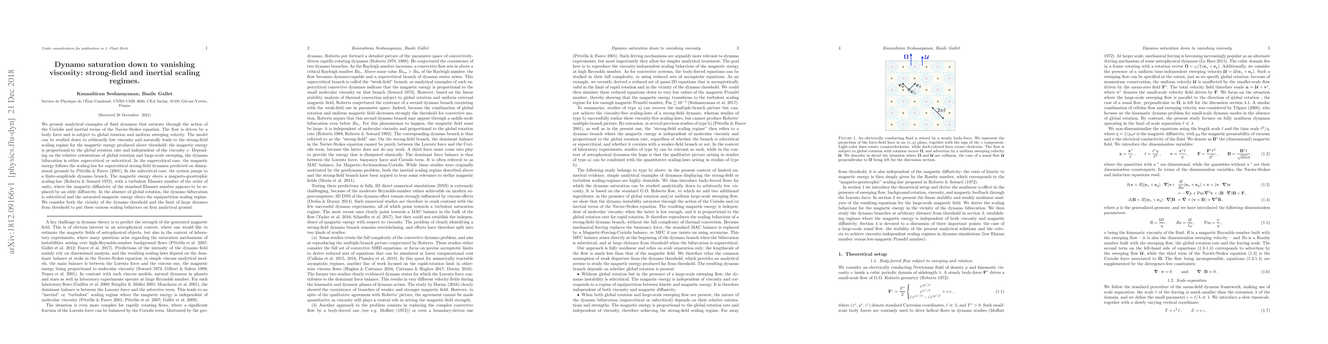 Researchers found that fluid dynamos can saturate at low viscosity levels, leading to strong-field scaling regimes with magnetic energy proportional to global rotation rate or turbulent Elsasser number.