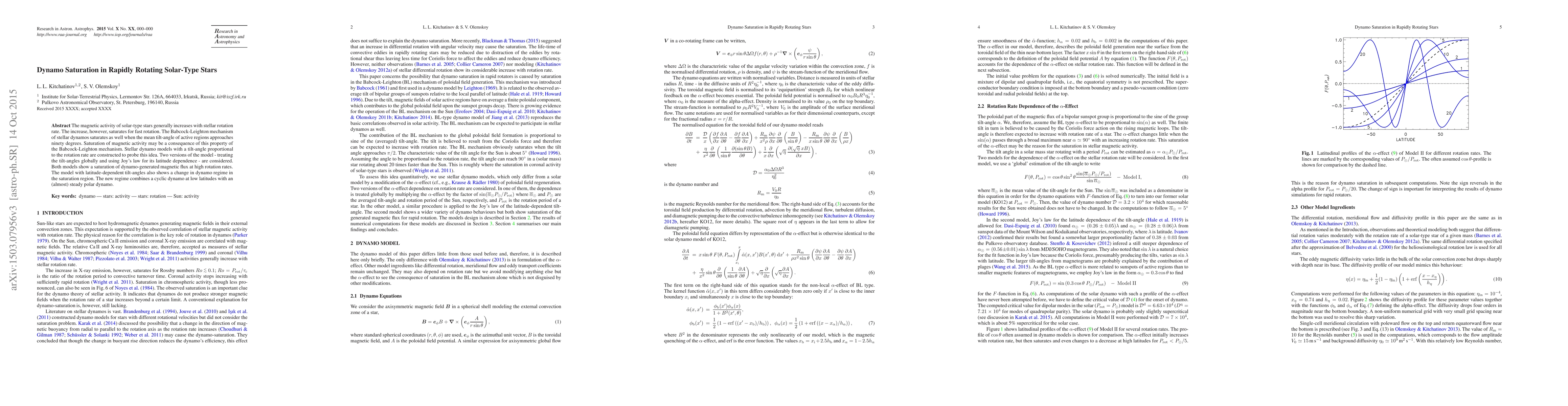 This paper explores the saturation of dynamo-generated magnetic activity in rapidly rotating solar-type stars, finding that the Babcock-Leighton mechanism reaches saturation as active regions' tilt-angles approach ninety degrees. Models show that magnetic flux saturates at high rotation rates, with a new regime combining cyclic and steady polar dynamos emerging.