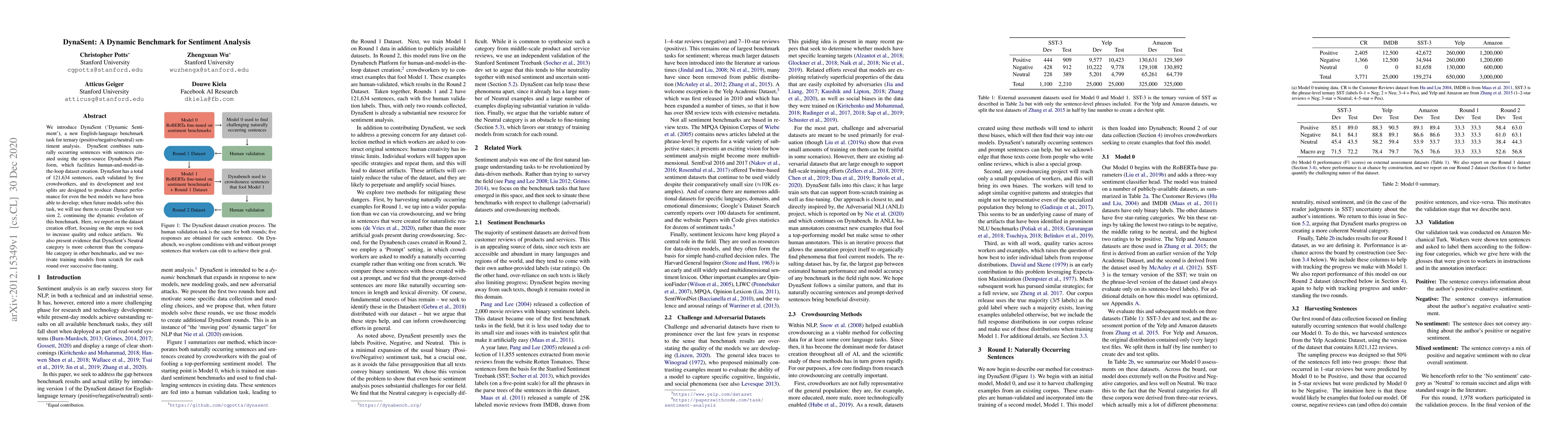We introduce DynaSent ('Dynamic Sentiment'), a new English-language benchmark task for ternary (positive/negative/neutral) sentiment analysis. DynaSent combines naturally occurring sentences with sentences created using the open-source Dynabench Platform, which facilities human-and-model-in-the-loop dataset creation. DynaSent has a total of 121,634 sentences, each validated by five crowdworkers, and its development and test splits are designed to produce chance performance for even the best models we have been able to develop; when future models solve this task, we will use them to create DynaSent version 2, continuing the dynamic evolution of this benchmark. Here, we report on the dataset creation effort, focusing on the steps we took to increase quality and reduce artifacts. We also present evidence that DynaSent's Neutral category is more coherent than the comparable category in other benchmarks, and we motivate training models from scratch for each round over successive fine-tuning.