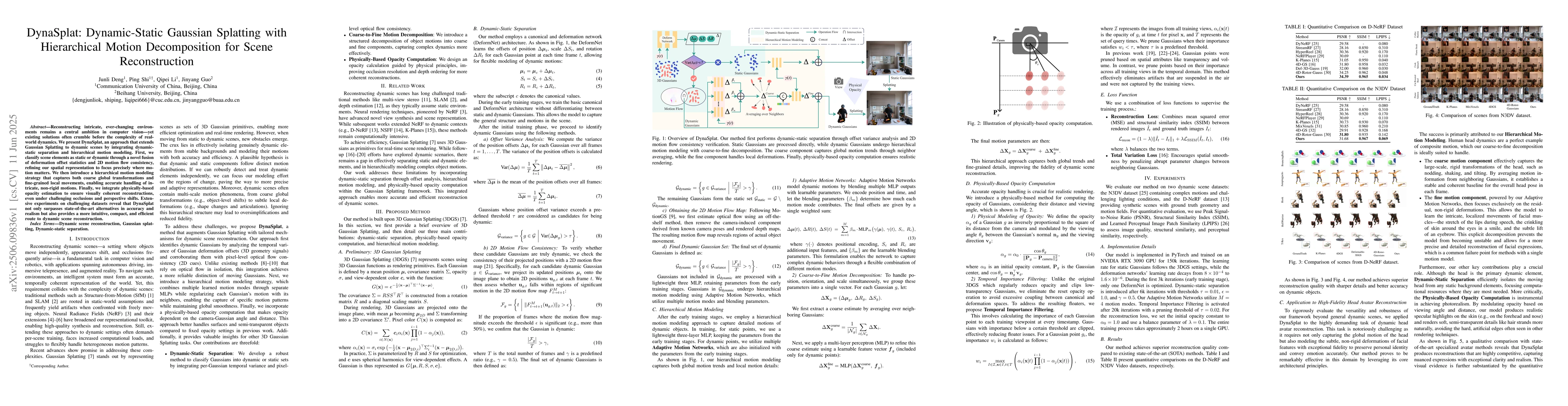 DynaSplat extends Gaussian Splatting to dynamic scenes by integrating dynamic-static separation and hierarchical motion modeling. It classifies scene elements as static or dynamic using deformation offset statistics and 2D motion flow consistency, then models complex motions with coarse global transformations and fine-grained local movements.