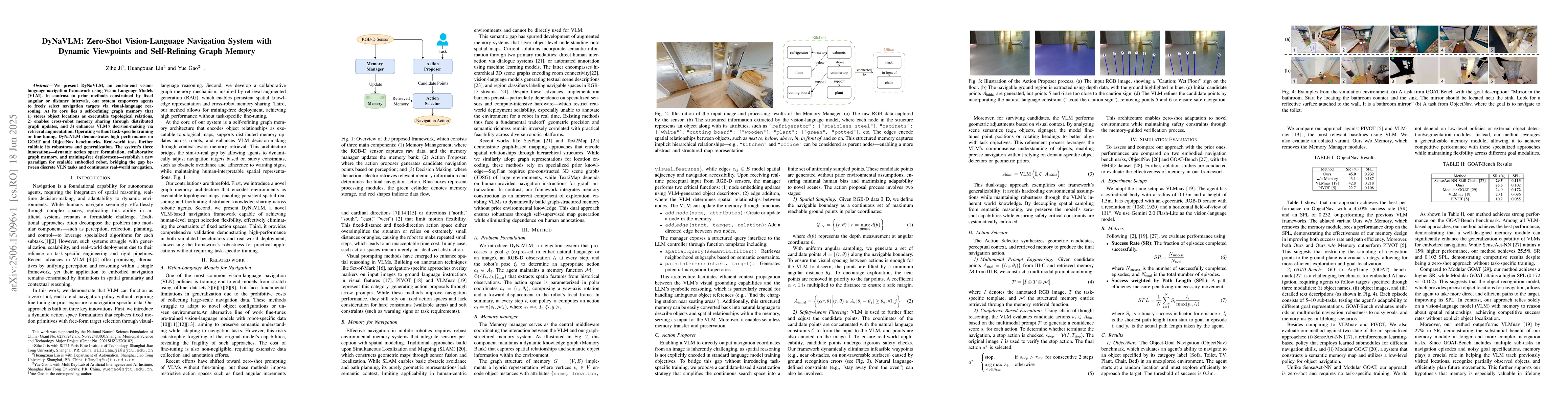 We present DyNaVLM, an end-to-end vision-language navigation framework using Vision-Language Models (VLM). In contrast to prior methods constrained by fixed angular or distance intervals, our system empowers agents to freely select navigation targets via visual-language reasoning. At its core lies a self-refining graph memory that 1) stores object locations as executable topological relations, 2) enables cross-robot memory sharing through distributed graph updates, and 3) enhances VLM's decision-making via retrieval augmentation. Operating without task-specific training or fine-tuning, DyNaVLM demonstrates high performance on GOAT and ObjectNav benchmarks. Real-world tests further validate its robustness and generalization. The system's three innovations: dynamic action space formulation, collaborative graph memory, and training-free deployment, establish a new paradigm for scalable embodied robot, bridging the gap between discrete VLN tasks and continuous real-world navigation.