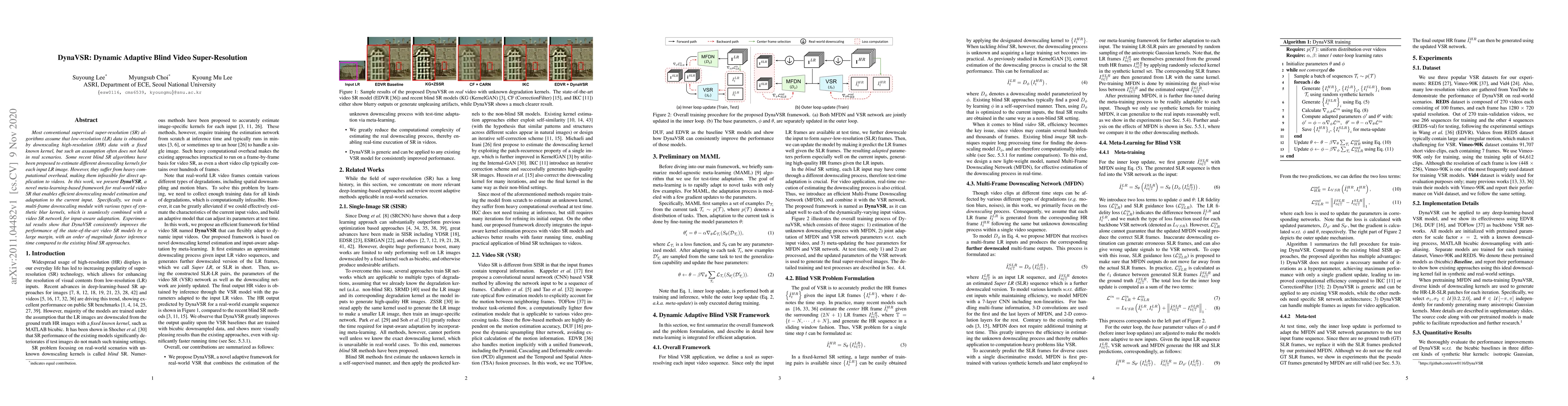 DynaVSR is a meta-learning-based framework for video super-resolution (SR) that efficiently estimates downscaling kernels and adapts to input data. It trains a multi-frame downscaling module with synthetic blur kernels, combined with a video SR network for input-aware adaptation.