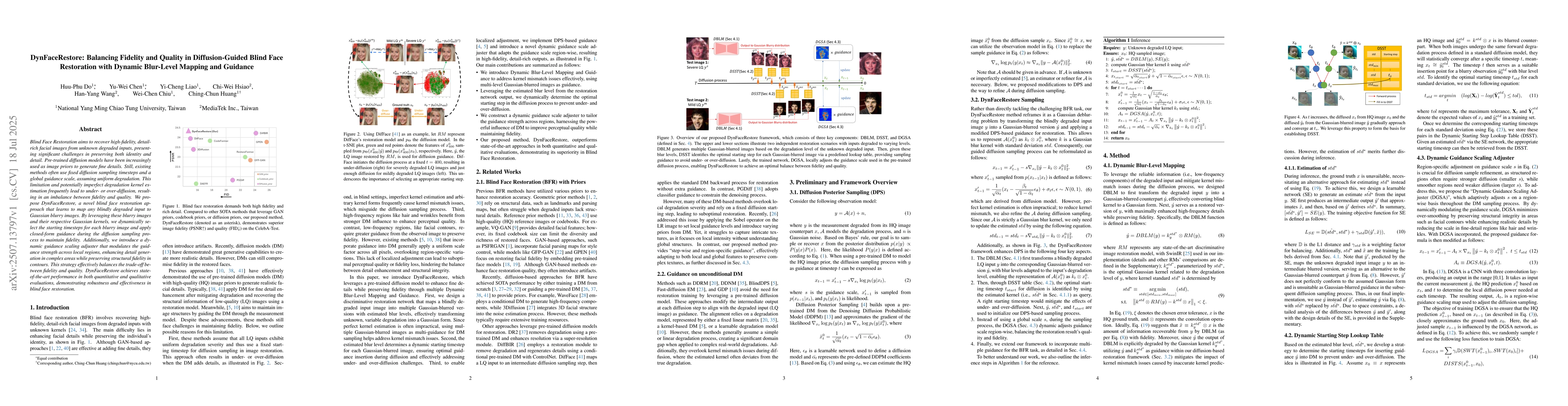 Blind Face Restoration aims to recover high-fidelity, detail-rich facial images from unknown degraded inputs, presenting significant challenges in preserving both identity and detail. Pre-trained diffusion models have been increasingly used as image priors to generate fine details. Still, existing methods often use fixed diffusion sampling timesteps and a global guidance scale, assuming uniform degradation. This limitation and potentially imperfect degradation kernel estimation frequently lead to under- or over-diffusion, resulting in an imbalance between fidelity and quality. We propose DynFaceRestore, a novel blind face restoration approach that learns to map any blindly degraded input to Gaussian blurry images. By leveraging these blurry images and their respective Gaussian kernels, we dynamically select the starting timesteps for each blurry image and apply closed-form guidance during the diffusion sampling process to maintain fidelity. Additionally, we introduce a dynamic guidance scaling adjuster that modulates the guidance strength across local regions, enhancing detail generation in complex areas while preserving structural fidelity in contours. This strategy effectively balances the trade-off between fidelity and quality. DynFaceRestore achieves state-of-the-art performance in both quantitative and qualitative evaluations, demonstrating robustness and effectiveness in blind face restoration.