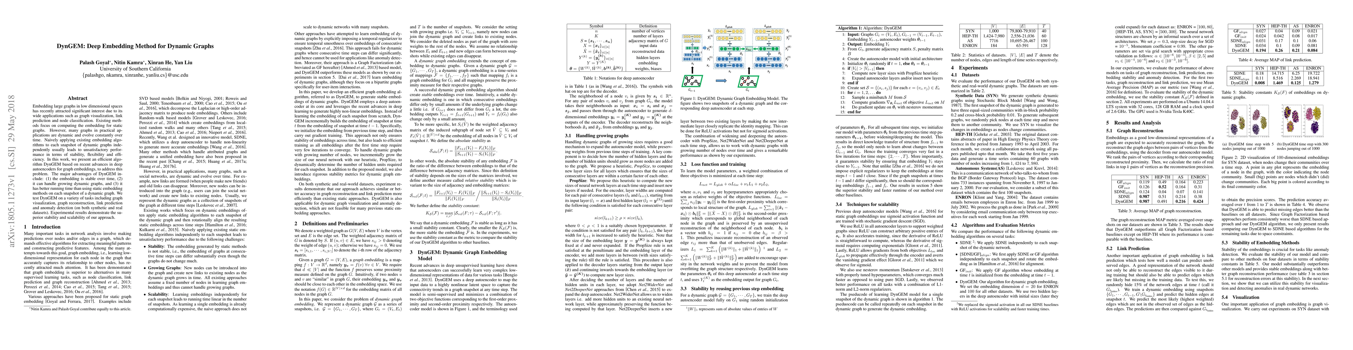 DynGEM is a deep embedding method for dynamic graphs, leveraging deep autoencoders to provide stable, scalable, and efficient embeddings. It outperforms static methods by maintaining consistent embeddings over time and effectively handling growing dynamic graphs.