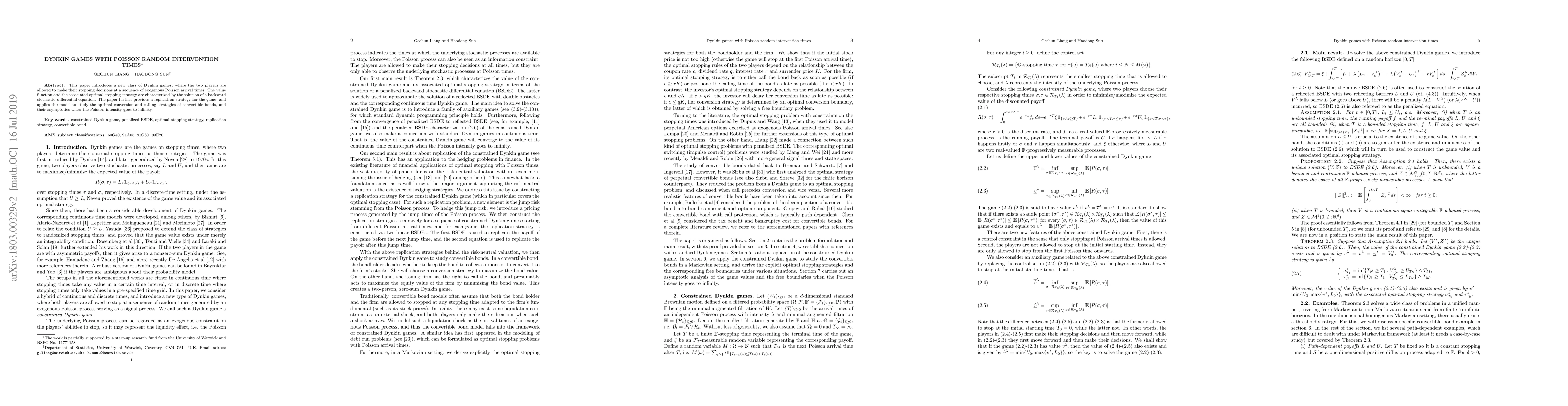 Researchers introduced a new class of Dynkin games that incorporate Poisson arrival times, allowing for optimal stopping strategies to be calculated using backward stochastic differential equations. The model is applied to study convertible bond strategies with implications for optimal conversion and calling tactics.