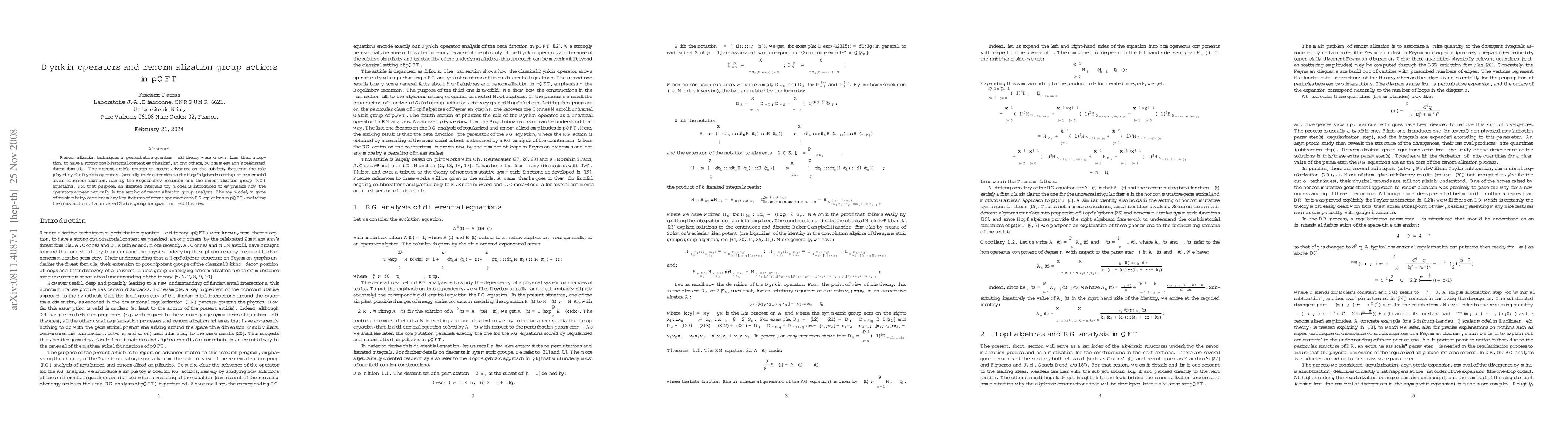 Renormalization techniques in perturbative quantum field theory were known, from their inception, to have a strong combinatorial content emphasized, among others, by Zimmermann's celebrated forest formula. The present article reports on recent advances on the subject, featuring the role played by the Dynkin operators (actually their extension to the Hopf algebraic setting) at two crucial levels of renormalization, namely the Bogolioubov recursion and the renormalization group (RG) equations. For that purpose, an iterated integrals toy model is introduced to emphasize how the operators appear naturally in the setting of renormalization group analysis. The toy model, in spite of its simplicity, captures many key features of recent approaches to RG equations in pQFT, including the construction of a universal Galois group for quantum field theories.