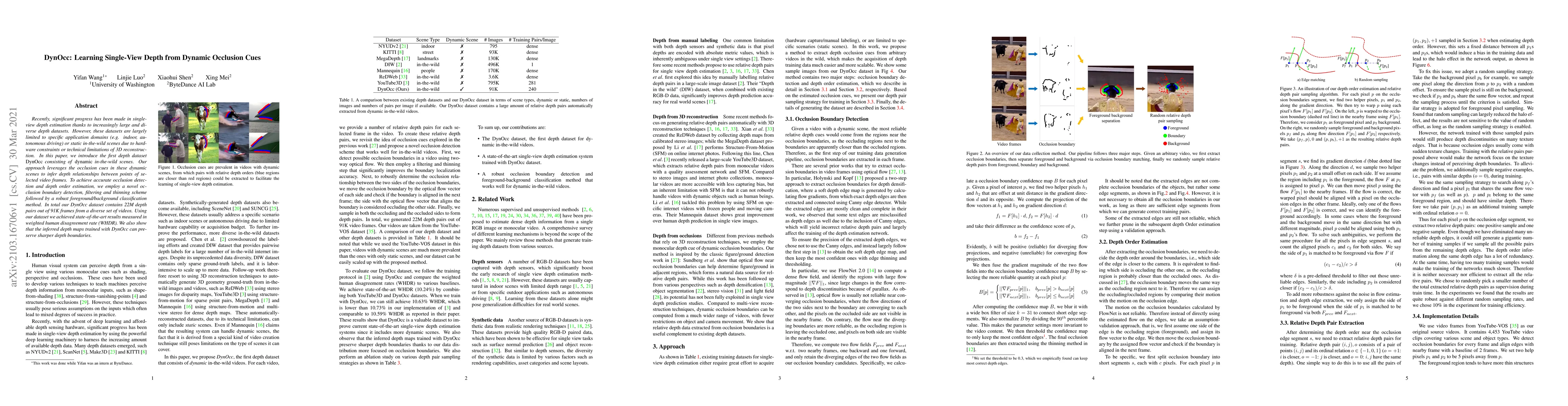 Recently, significant progress has been made in single-view depth estimation thanks to increasingly large and diverse depth datasets. However, these datasets are largely limited to specific application domains (e.g. indoor, autonomous driving) or static in-the-wild scenes due to hardware constraints or technical limitations of 3D reconstruction. In this paper, we introduce the first depth dataset DynOcc consisting of dynamic in-the-wild scenes. Our approach leverages the occlusion cues in these dynamic scenes to infer depth relationships between points of selected video frames. To achieve accurate occlusion detection and depth order estimation, we employ a novel occlusion boundary detection, filtering and thinning scheme followed by a robust foreground/background classification method. In total our DynOcc dataset contains 22M depth pairs out of 91K frames from a diverse set of videos. Using our dataset we achieved state-of-the-art results measured in weighted human disagreement rate (WHDR). We also show that the inferred depth maps trained with DynOcc can preserve sharper depth boundaries.