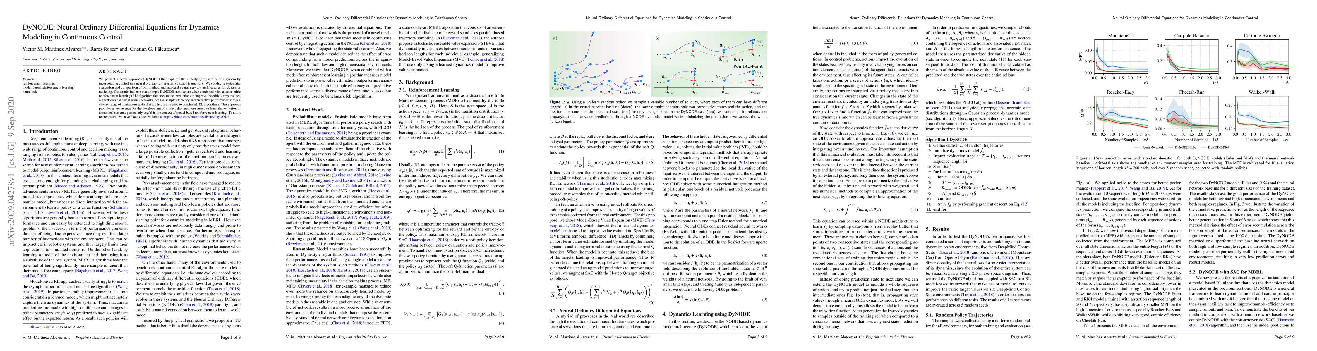 DyNODE integrates neural ordinary differential equations with control to model system dynamics, achieving superior sample efficiency and predictive performance compared to standard neural networks in continuous control tasks. This method enhances model-based reinforcement learning by providing a more accurate representation of dynamical systems.