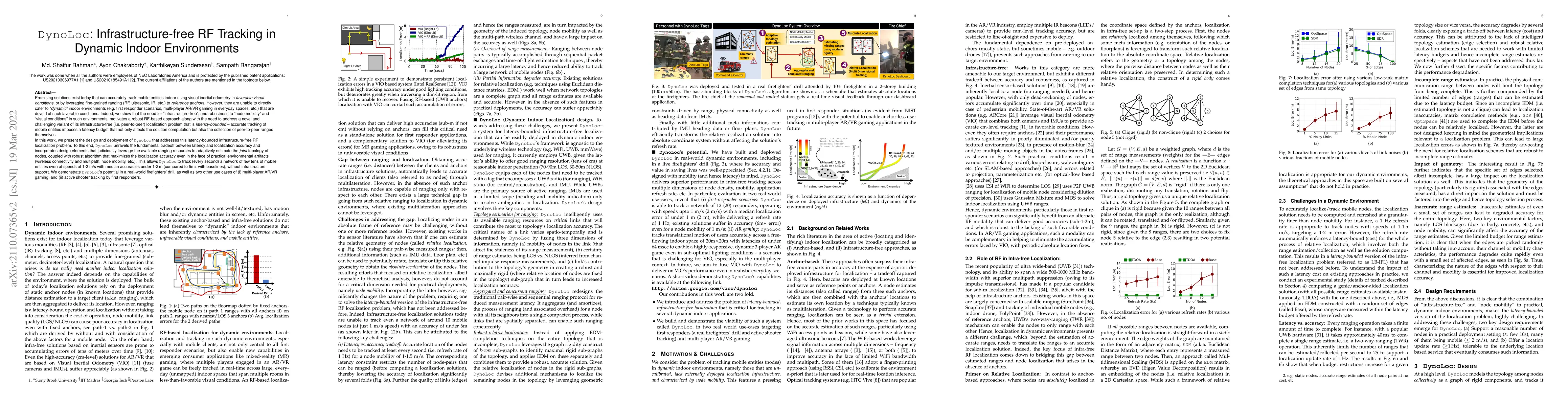 Promising solutions exist today that can accurately track mobile entities indoor using visual inertial odometry in favorable visual conditions, or by leveraging fine-grained ranging (RF, ultrasonic, IR, etc.) to reference anchors. However, they are unable to directly cater to "dynamic" indoor environments (e.g. first responder scenarios, multi-player AR/VR gaming in everyday spaces, etc.) that are devoid of such favorable conditions. Indeed, we show that the need for "infrastructure-free", and robustness to "node mobility" and "visual conditions" in such environments, motivates a robust RF-based approach along with the need to address a novel and challenging variant of its infrastructure-free (i.e. peer-to-peer) localization problem that is latency-bounded - accurate tracking of mobile entities imposes a latency budget that not only affects the solution computation but also the collection of peer-to-peer ranges themselves. In this work, we present the design and deployment of DynoLoc that addresses this latency-bounded infrastructure-free RF localization problem. To this end, DynoLoc unravels the fundamental tradeoff between latency and localization accuracy and incorporates design elements that judiciously leverage the available ranging resources to adaptively estimate the joint topology of nodes, coupled with robust algorithm that maximizes the localization accuracy even in the face of practical environmental artifacts (wireless connectivity and multipath, node mobility, etc.). This allows DynoLoc to track (every second) a network of few tens of mobile entities even at speeds of 1-2 m/s with median accuracies under 1-2 m (compared to 5m+ with baselines), without infrastructure support. We demonstrate DynoLoc's potential in a real-world firefighters' drill, as well as two other use cases of (i) multi-player AR/VR gaming, and (ii) active shooter tracking by first responders.