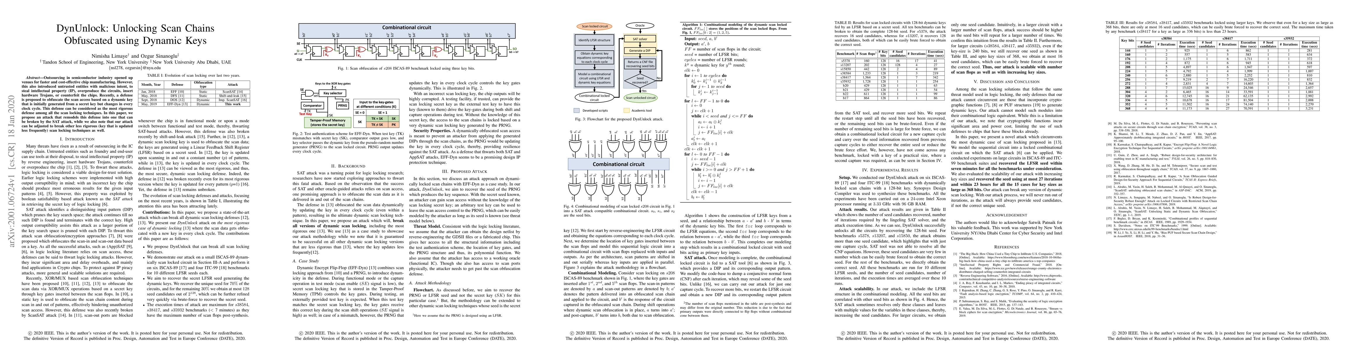 Title: DynUnlock: Unlocking Scan Chains Obfuscated using Dynamic Keys Summary: This paper proposes an attack to break scan chain obfuscation techniques using dynamic keys, demonstrating that these defenses can be compromised by SAT attacks, even for less frequent key updates.
