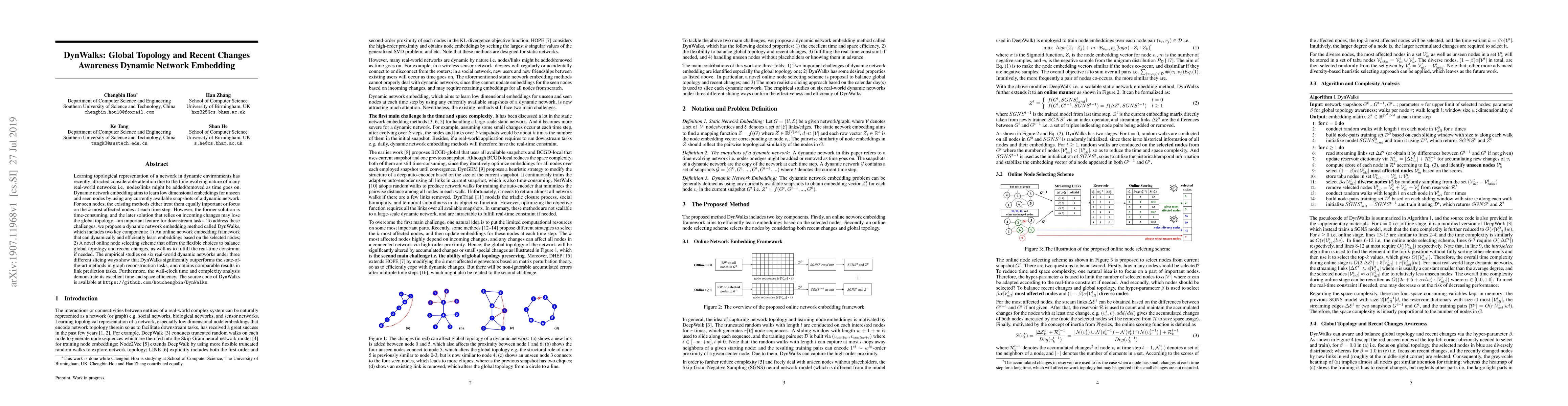 Learning topological representation of a network in dynamic environments has recently attracted considerable attention due to the time-evolving nature of many real-world networks i.e. nodes/links might be added/removed as time goes on. Dynamic network embedding aims to learn low dimensional embeddings for unseen and seen nodes by using any currently available snapshots of a dynamic network. For seen nodes, the existing methods either treat them equally important or focus on the $k$ most affected nodes at each time step. However, the former solution is time-consuming, and the later solution that relies on incoming changes may lose the global topology---an important feature for downstream tasks. To address these challenges, we propose a dynamic network embedding method called DynWalks, which includes two key components: 1) An online network embedding framework that can dynamically and efficiently learn embeddings based on the selected nodes; 2) A novel online node selecting scheme that offers the flexible choices to balance global topology and recent changes, as well as to fulfill the real-time constraint if needed. The empirical studies on six real-world dynamic networks under three different slicing ways show that DynWalks significantly outperforms the state-of-the-art methods in graph reconstruction tasks, and obtains comparable results in link prediction tasks. Furthermore, the wall-clock time and complexity analysis demonstrate its excellent time and space efficiency. The source code of DynWalks is available at https://github.com/houchengbin/DynWalks
