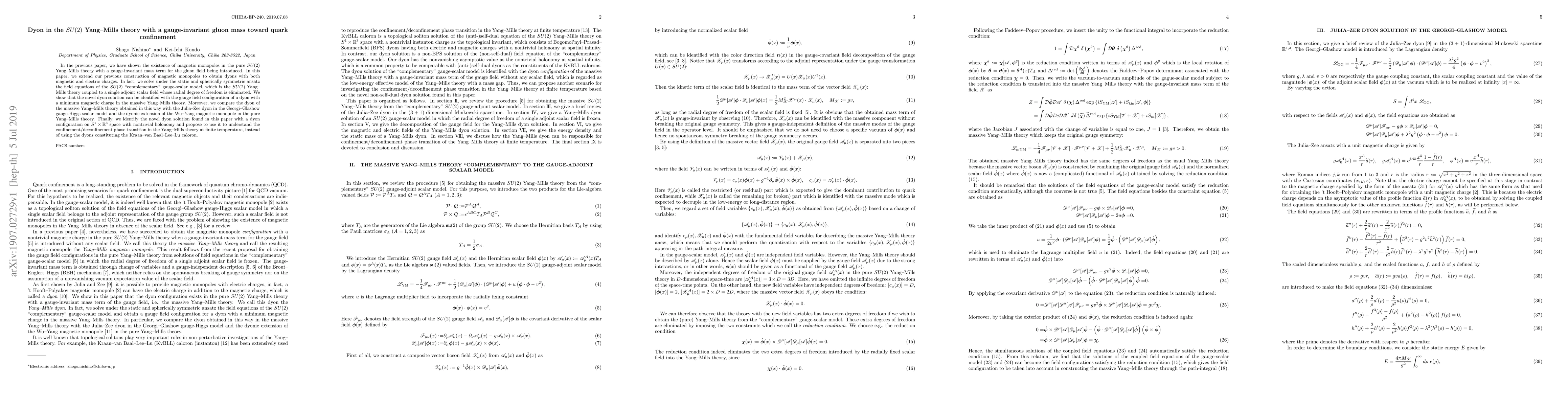 This paper extends the study of magnetic monopoles in $SU(2)$ Yang--Mills theory with a gauge-invariant gluon mass to dyons, which possess both magnetic and electric charges. The authors solve the field equations in a complementary gauge-scalar model, identifying a novel dyon configuration with potential implications for quark confinement.