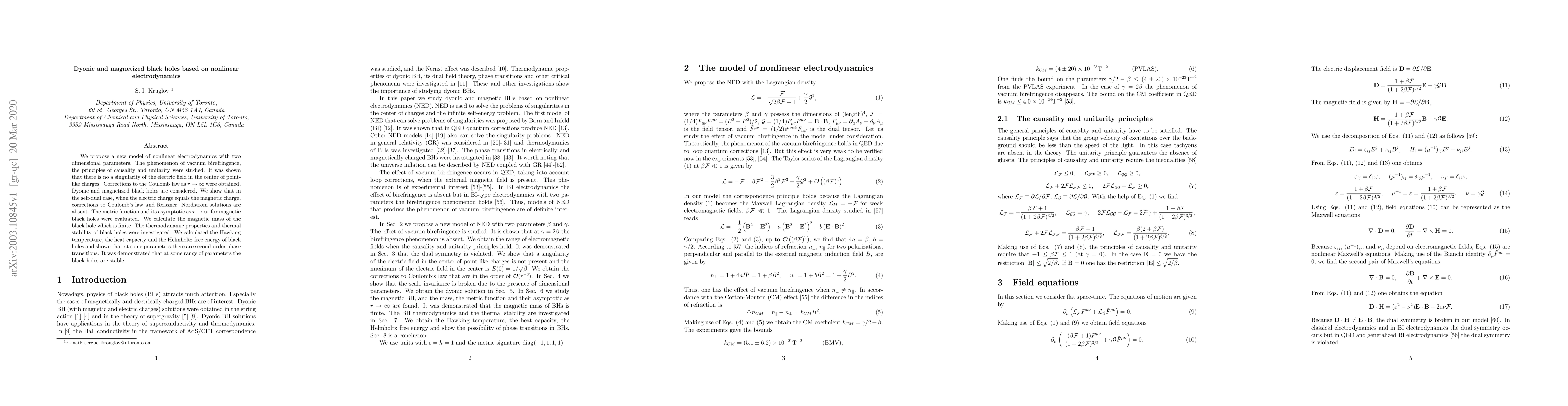 We propose a new model of nonlinear electrodynamics with two dimensional parameters. The phenomenon of vacuum birefringence, the principles of causality and unitarity were studied. It was shown that there is no a singularity of the electric field in the center of point-like charges. Corrections to the Coulomb law as $r\rightarrow\infty$ were obtained. Dyonic and magnetized black holes are considered. We show that in the self-dual case, when the electric charge equals the magnetic charge, corrections to Coulomb's law and Reissner$-$Nordstr\"{o}m solutions are absent. The metric function and its asymptotic as $r\rightarrow\infty$ for magnetic black holes were evaluated. We calculate the magnetic mass of the black hole which is finite. The thermodynamic properties and thermal stability of black holes were investigated. We calculated the Hawking temperature, the heat capacity and the Helmholtz free energy of black holes and shown that at some parameters there are second-order phase transitions. It was demonstrated that at some range of parameters the black holes are stable.