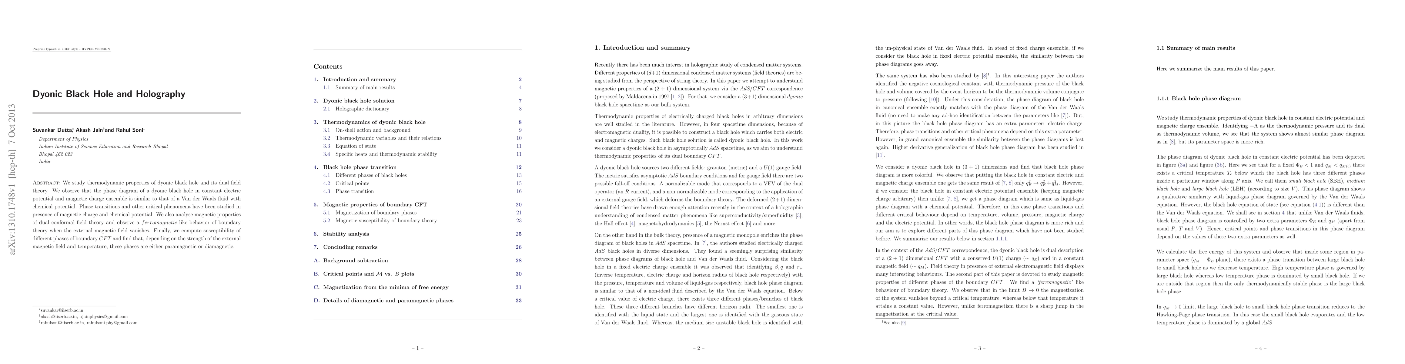 We study thermodynamic properties of dyonic black hole and its dual field theory. We observe that the phase diagram of a dyonic black hole in constant electric potential and magnetic charge ensemble is similar to that of a Van der Waals fluid with chemical potential. Phase transitions and other critical phenomena have been studied in presence of magnetic charge and chemical potential. We also analyse magnetic properties of dual conformal field theory and observe a ferromagnetic like behavior of boundary theory when the external magnetic field vanishes. Finally, we compute susceptibility of different phases of boundary CFT and find that, depending on the strength of the external magnetic field and temperature, these phases are either paramagnetic or diamagnetic.
