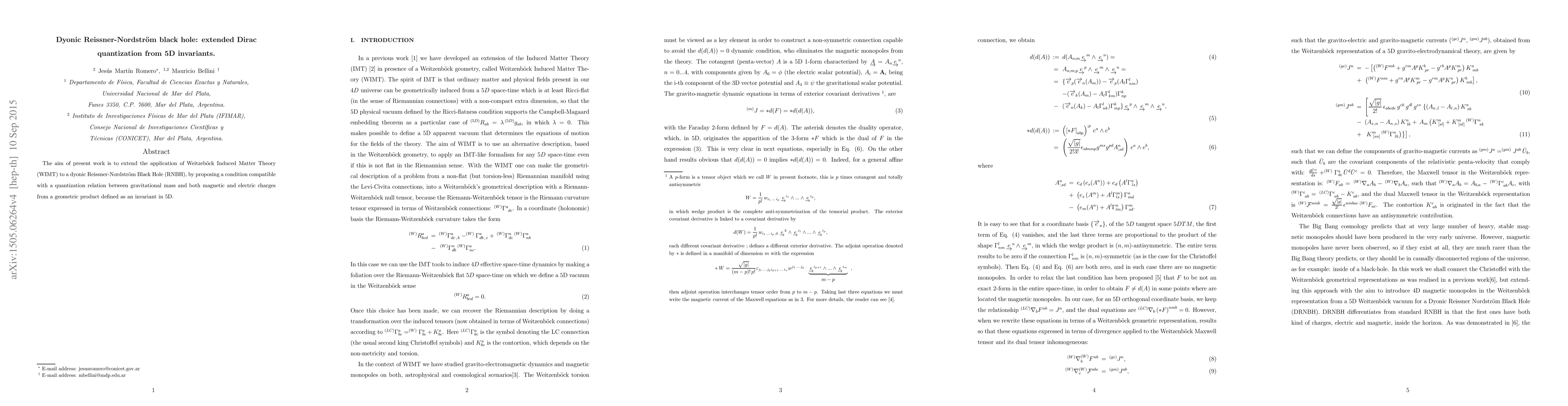 Summary: This paper extends Weitzebock Induced Matter Theory to a dyonic Reissner-Nordström black hole, proposing a geometric product invariant in 5D to establish a quantization relation between gravitational mass and magnetic and electric charges.