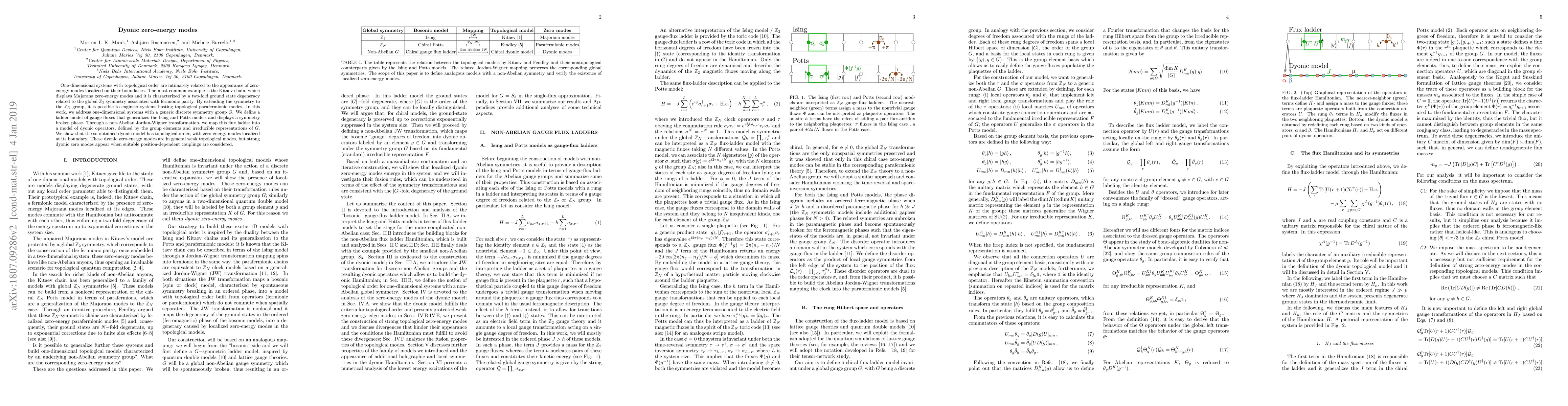 One-dimensional systems with topological order are intimately related to the appearance of zero-energy modes localized on their boundaries. The most common example is the Kitaev chain, which displays Majorana zero-energy modes and it is characterized by a two-fold ground state degeneracy related to the global $\mathbb{Z}_2$ symmetry associated with fermionic parity. By extending the symmetry to the $\mathbb{Z}_N$ group, it is possible to engineer systems hosting topological parafermionic modes. In this work, we address one-dimensional systems with a generic discrete symmetry group $G$. We define a ladder model of gauge fluxes that generalizes the Ising and Potts models and displays a symmetry broken phase. Through a non-Abelian Jordan-Wigner transformation, we map this flux ladder into a model of dyonic operators, defined by the group elements and irreducible representations of $G$. We show that the so-obtained dyonic model has topological order, with zero-energy modes localized at its boundary. These dyonic zero-energy modes are in general weak topological modes, but strong dyonic zero modes appear when suitable position-dependent couplings are considered.