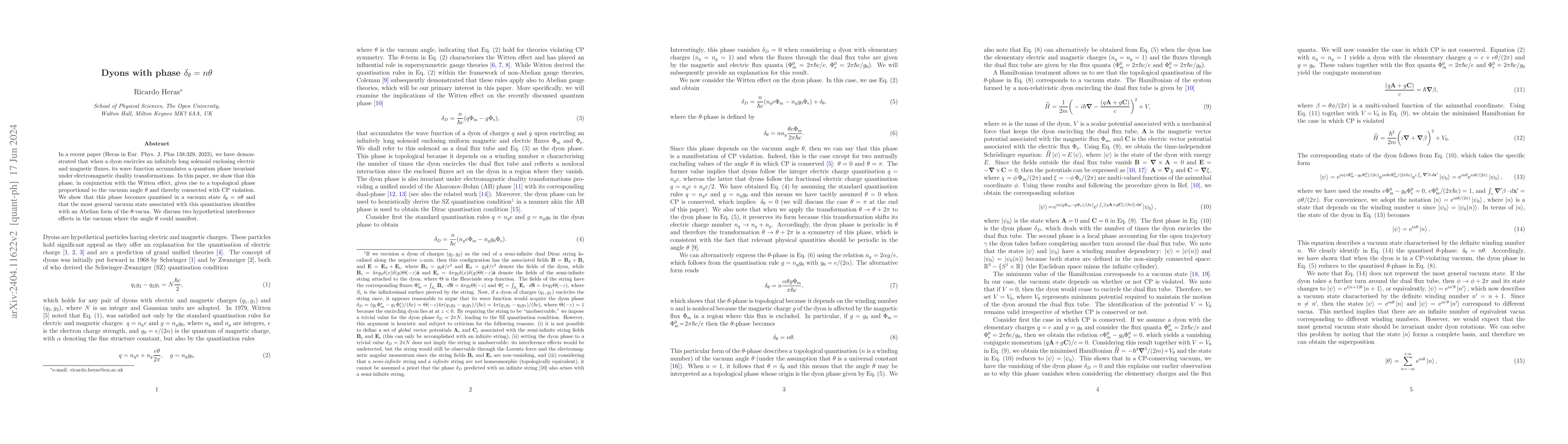 In a recent paper (Heras in Eur. Phys. J. Plus 138: 329, 2023), we have demonstrated that when a dyon encircles an infinitely long solenoid enclosing electric and magnetic fluxes, its wave function accumulates a quantum phase invariant under electromagnetic duality transformations. In this paper, we show that this phase, in conjunction with the Witten effect, gives rise to a topological phase proportional to the vacuum angle $\theta$ and thereby connected with CP violation. We show that this phase becomes quantised in a vacuum state $\delta_{\theta}=n\theta$ and that the most general vacuum state associated with this quantisation identifies with an Abelian form of the $\theta$-vacua. We discuss two hypothetical interference effects in the vacuum where the angle $\theta$ could manifest.