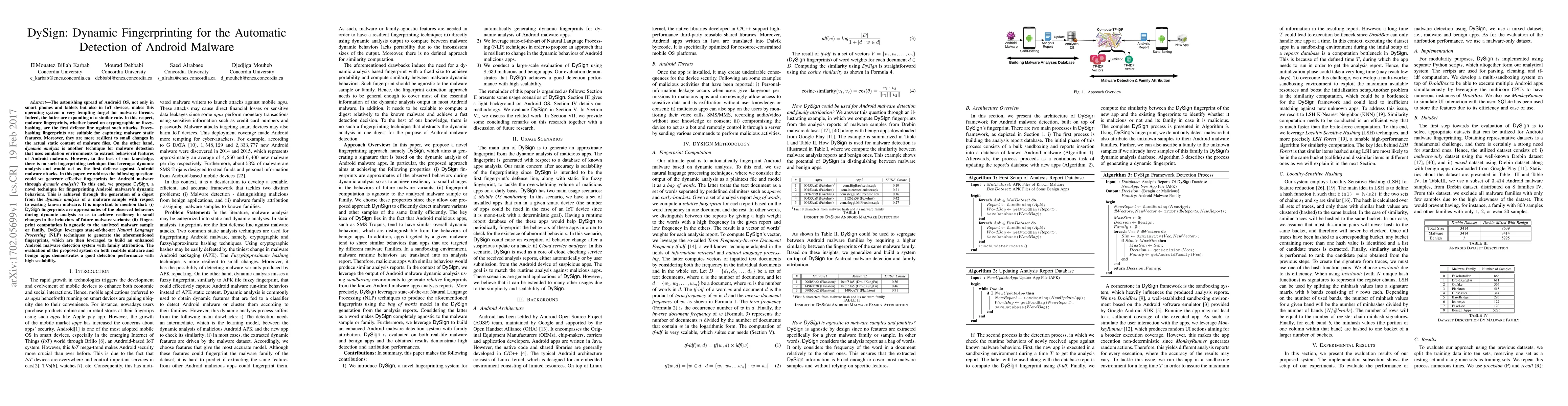 DySign proposes a novel dynamic fingerprinting technique for detecting Android malware by analyzing behavioral features through emulation. This method generates resilient fingerprints using Natural Language Processing, enabling effective detection and family attribution of malware variants.