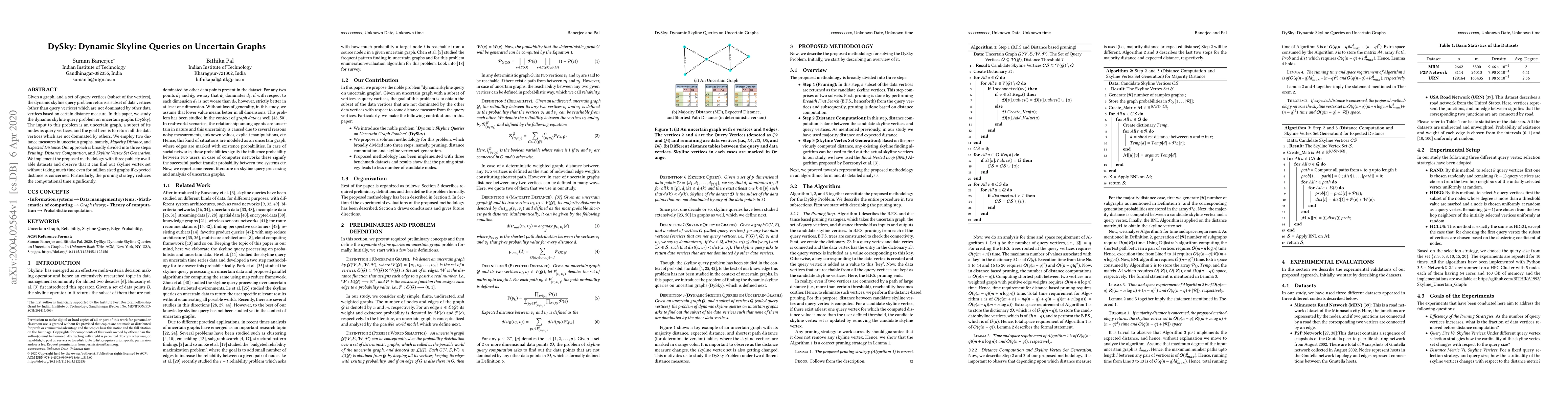 This paper proposes DySky, a method for dynamic skyline queries on uncertain graphs, employing Majority and Expected Distance measures. It involves pruning, distance computation, and skyline generation, and demonstrates efficient performance on large datasets.