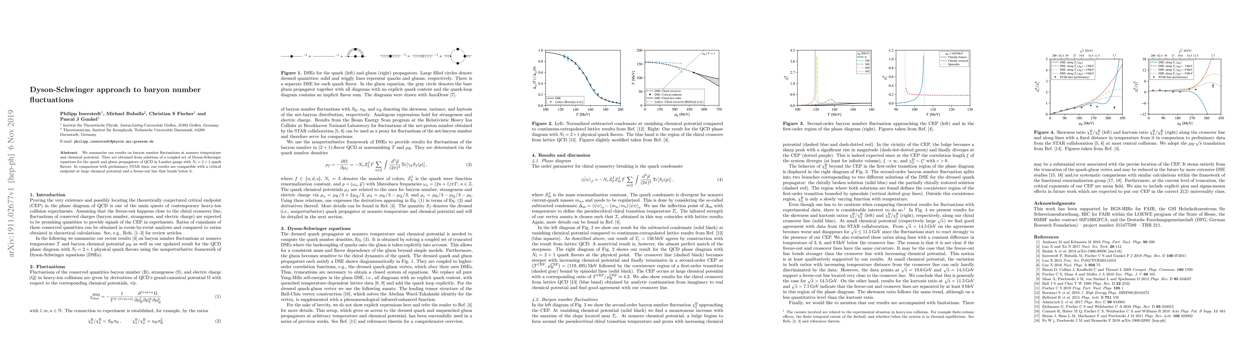 We summarize our results on baryon number fluctuations at nonzero temperature and chemical potential. They are obtained from solutions of a coupled set of Dyson-Schwinger equations for the quark and gluon propagators of QCD in Landau gauge with $N_f=2+1$ quark flavors. In comparison with preliminary STAR data, our results are compatible with a critical endpoint at large chemical potential and a freeze-out line that bends below it.