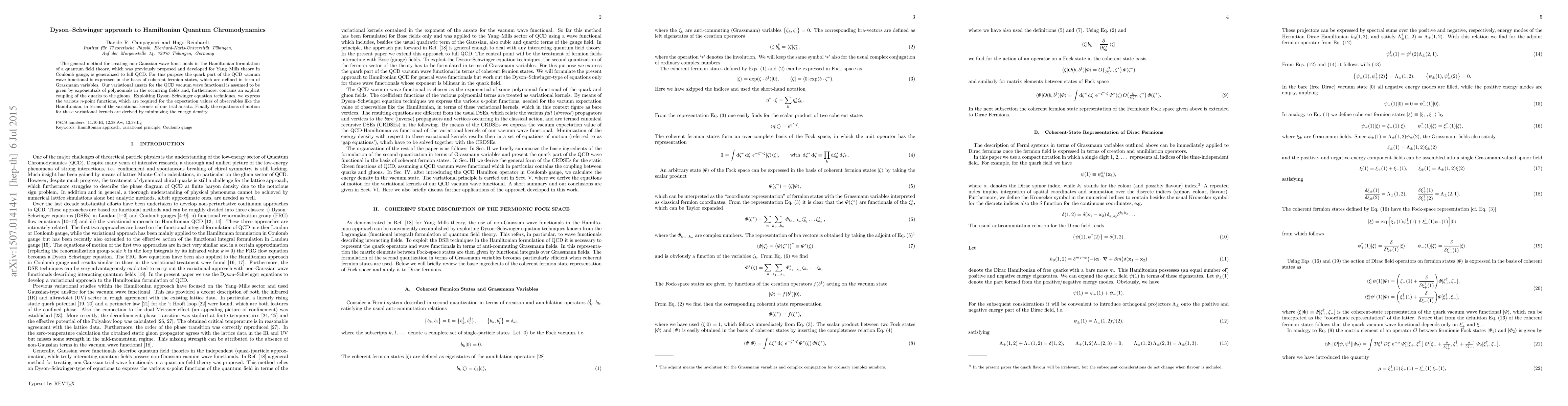 This paper generalizes the Dyson-Schwinger approach to Hamiltonian Quantum Chromodynamics (QCD) by expressing the quark part of the QCD vacuum wave functional in terms of coherent fermion states. The authors derive equations of motion for variational kernels by minimizing the energy density, using Dyson-Schwinger techniques to relate $n$-point functions to the trial ansatz.