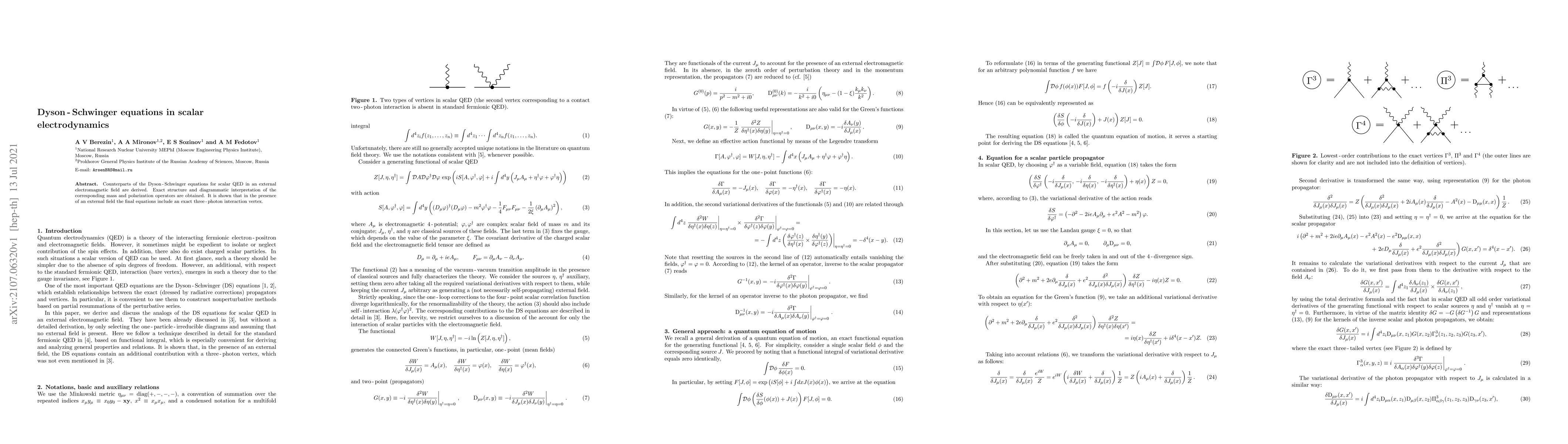 Researchers derived Dyson-Schwinger equations for scalar electrodynamics in an external electromagnetic field, showing a three-photon interaction vertex, and obtained exact structure and diagrammatic interpretation of mass and polarization operators.