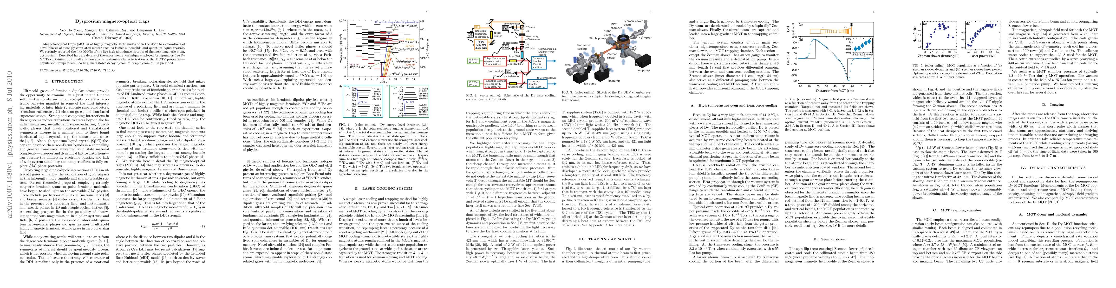 This study details the creation of magneto-optical traps for dysprosium isotopes, allowing for investigations into strongly correlated matter phases. The technique achieves repumper-free traps with up to half a billion atoms, accompanied by comprehensive characterization of trap properties.