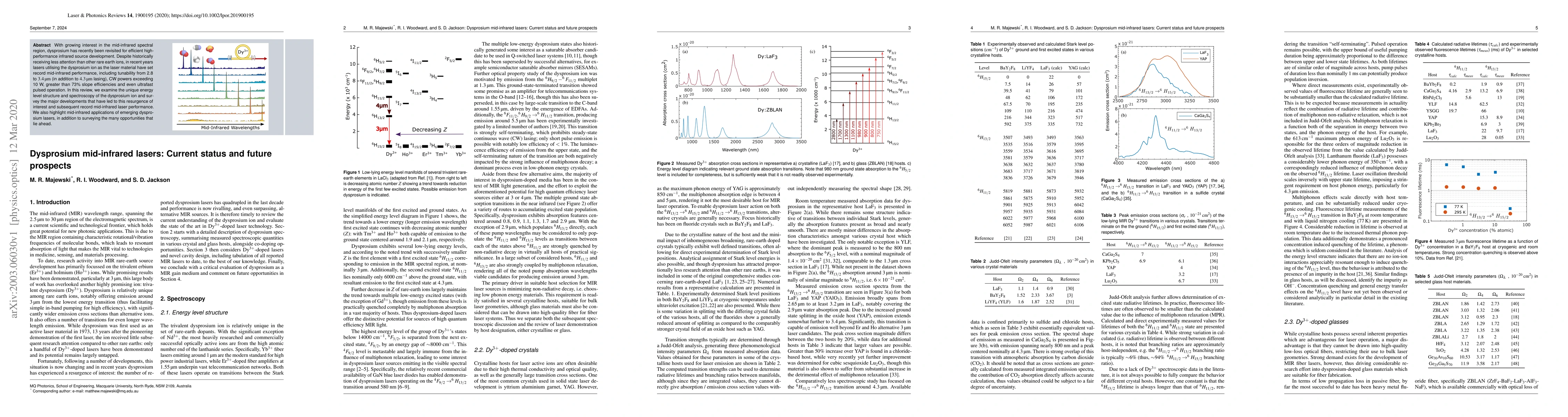 Dysprosium ion lasers have recently achieved record mid-infrared performance, including tunability from 2.8 to 3.4 µm and continuous wave powers exceeding 10 W. The unique energy level structure and spectroscopy of dysprosium, along with major developments, have reignited interest in this rare earth ion for mid-infrared applications.