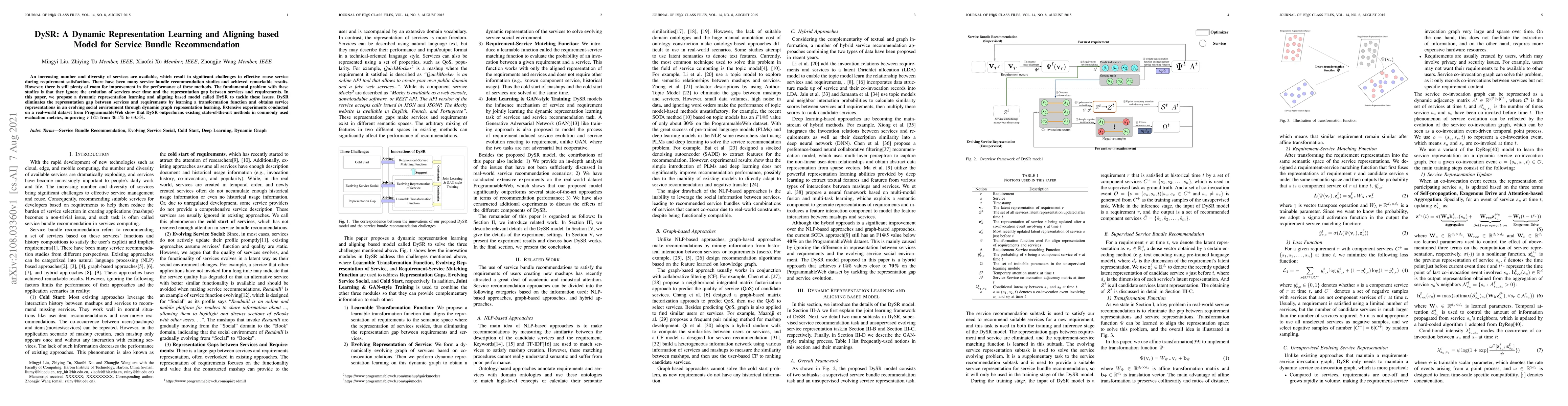 DySR is a new model that improves service bundle recommendation by addressing the evolution of services over time and representation gap between services and requirements, outperforming existing methods with significant gains in evaluation metrics.