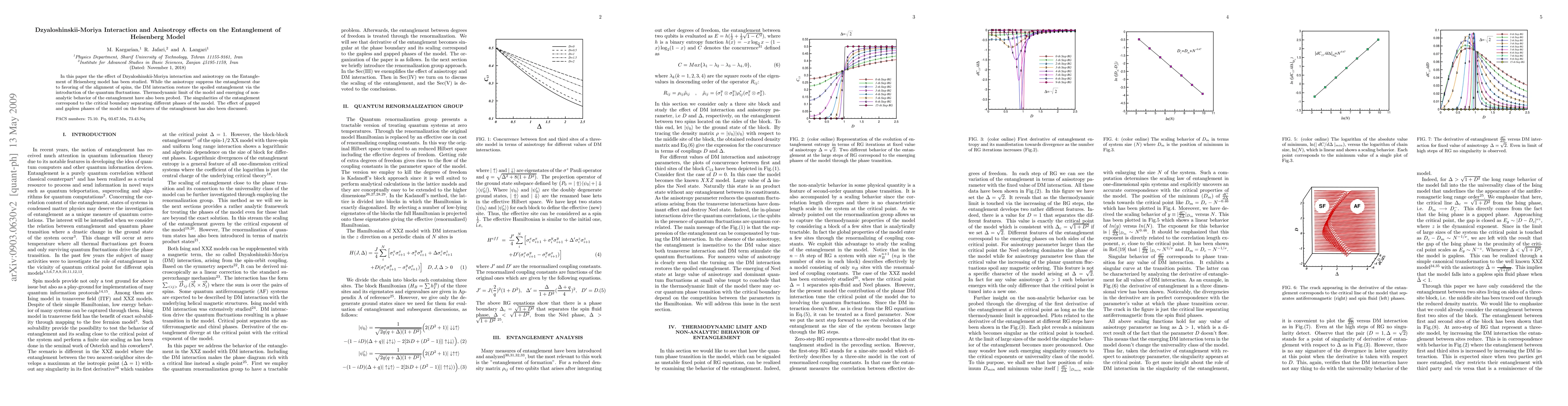 This paper investigates how Dzyaloshinskii-Moriya interaction and anisotropy affect the entanglement in a Heisenberg chain model. Anisotropy reduces entanglement by favoring spin alignment, while the DM interaction restores it through quantum fluctuations, leading to non-analytic behavior and critical boundary singularities in the thermodynamic limit.