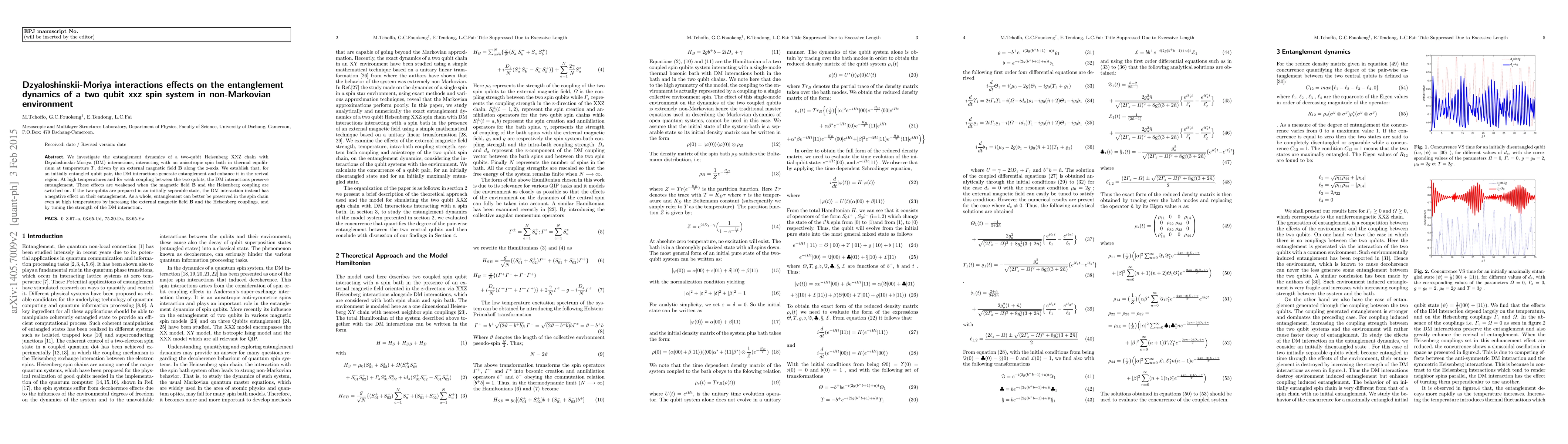 This paper explores the entanglement dynamics in a two-qubit Heisenberg XXZ chain with Dzyaloshinskii-Moriya interactions in a non-Markovian environment. It finds that DM interactions enhance entanglement revival in initially entangled states, especially at high temperatures and weak qubit coupling, while diminishing entanglement in initially separable states.